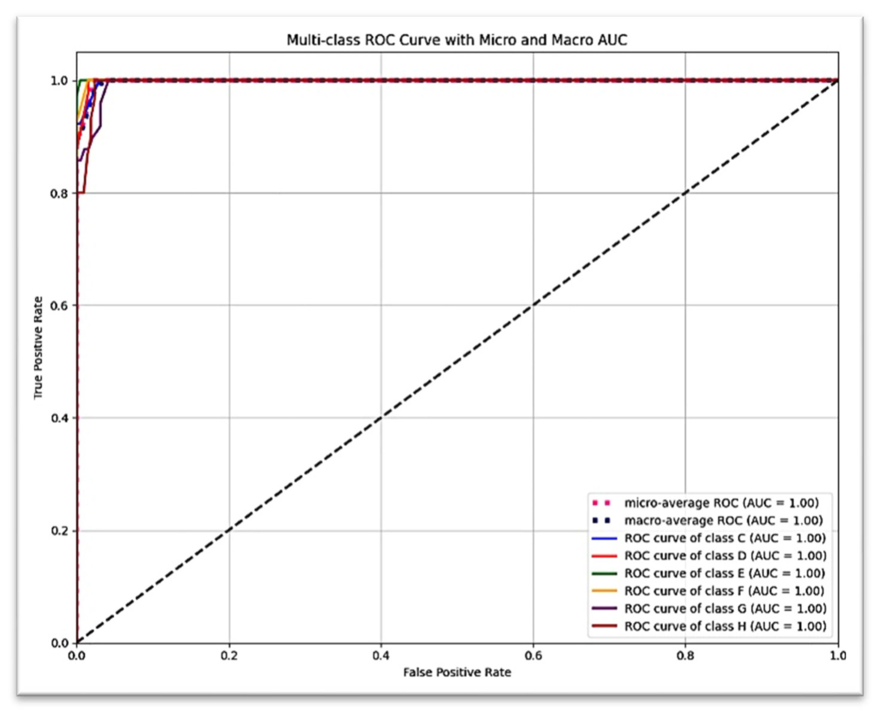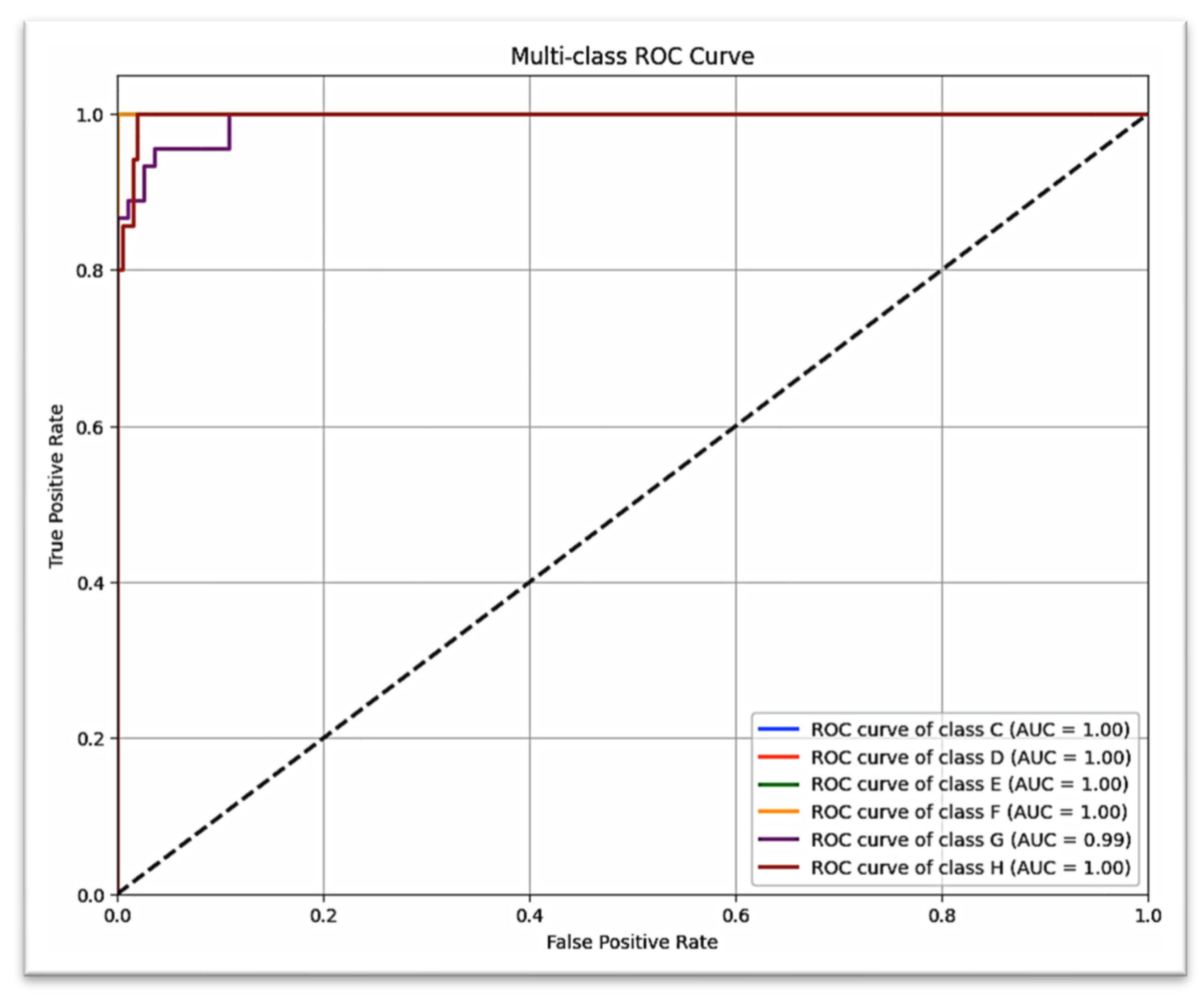 Figure 6, revealed an AUC = 1.00 (with the exception of stage G: AUC = 0.99), suggesting excellent discriminatory power (stages C, D, E, F, and H: AUC = 1.00).