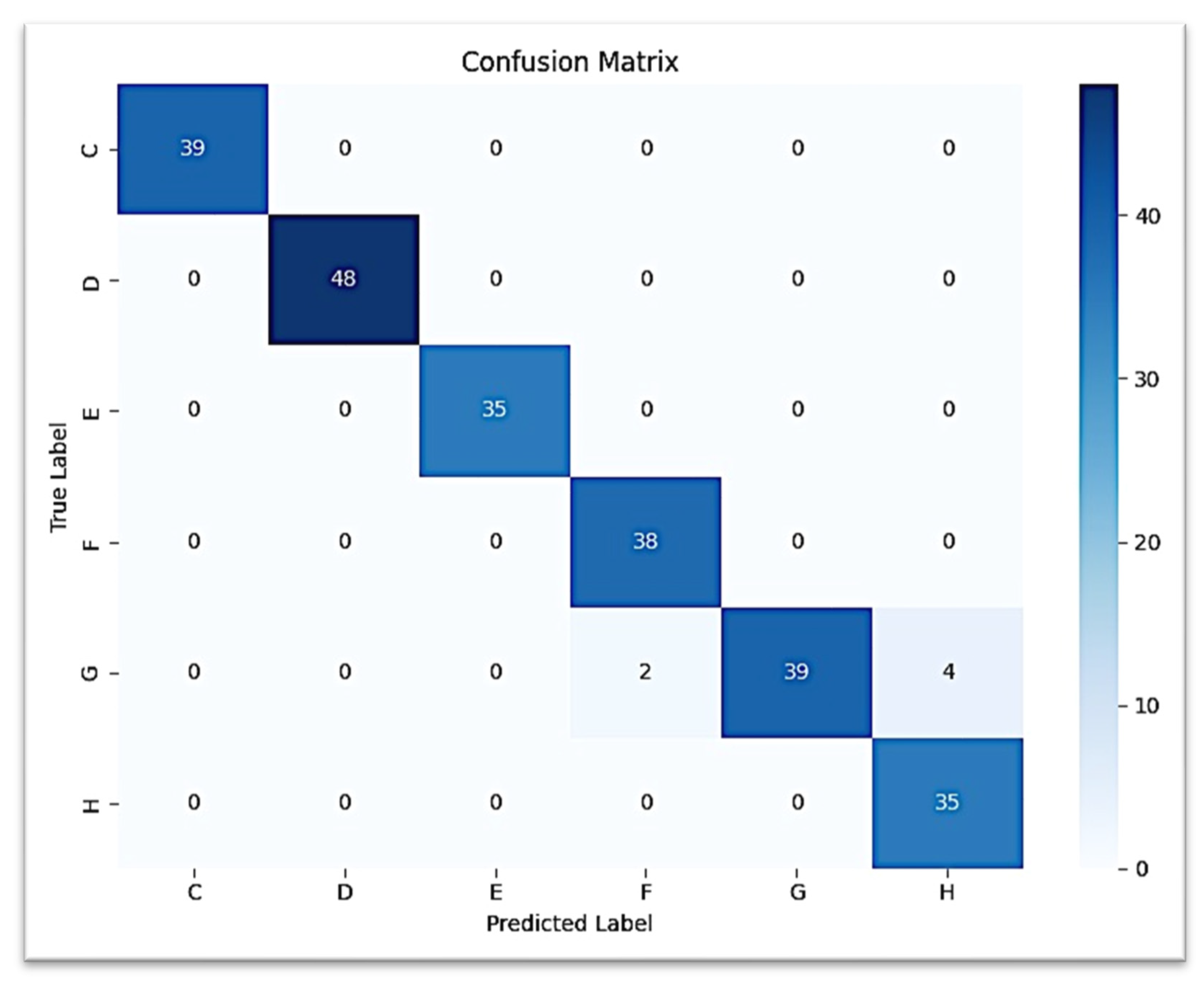 Therefore, only stages C–H were present in both the true labels and predicted labels. This explains why stages A and B do not appear in the classification outcomes. The focus on C–H stages is consistent with previous studies applying Demirjian’s method in orthodontic and forensic contexts, where younger age groups (below 6–7 years) are required to capture the earliest calcification stages.