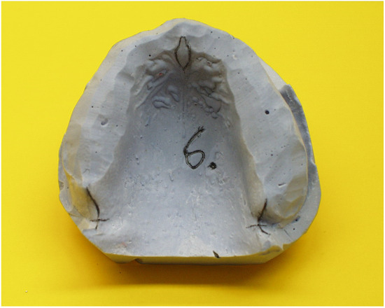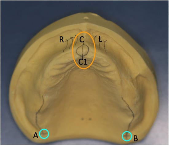 In this prospective study, 10 male and 10 female, Caucasian, third-year undergraduate dental students were randomly selected. All the students had complete upper and lower natural dental arches, no fixed dental prostheses of any type, and were orthodontically untreated. Two upper jaw impressions were made as part of their clinical exercise using modified Rim LOCK trays (Orbilock®, Orbis Dental, Offenbach, Germany) and an alginate impression material (Palgaflex®, ESPE, Seefeld, Germany). All the impressions were filled with type III dental stone. Two groups of 20 identical duplicate maxillary models were made in this way, with one group of 20 casts serving as control. The remaining 20 casts were prepared by eliminating all teeth with a gypsum-milling cutter. In addition, the alveolar ridge was removed until it had the typical shape of an edentulous jaw. Care was taken to ensure that the two directional points (A and B), the induction points (C, C1), and the conclusion lines (CR and CL) remained on the cast (Figure 3).