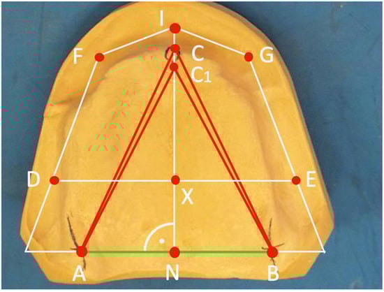 The combined use of these landmarks should allow a precise indication of the former position of the natural teeth in a partially edentulous or edentulous jaw with mathematical calculations [8,9] (Figure 2). The aim of this study was to examine the effectiveness of the system in reconstructing the former position of lost teeth in the edentulous maxillary jaw.