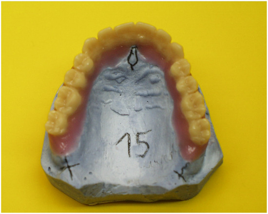 For the fabrication of a partial or a complete denture, it is important to re-establish the occlusal plane and the vertical dimension of occlusion of the patient. Arrangement of artificial teeth plays an important role in this process, ensuring not only stable occlusion but also functional performance and esthetic acceptance. For patients needing complete dentures, there are several methods described in the literature to determine the vertical dimension of occlusion, register centric relation, and provide occlusal schemes of acrylic teeth [1,2,3]. However, denture teeth set-up remains an important laboratory stage that is affected by opposing dentition, arch shape, alveolar resorption, facial esthetics, and speech. Wax rims present the standard procedure for setting artificial teeth, while modern technological advances offer the option for digital arrangement [4,5]. Facial characteristics provide a reference for teeth selection and arrangement, resulting in typical prostheses without anatomical customization. In 1981, Staub suggested that it is possible to reconstruct the position of the former (lost) natural teeth of a totally or partially edentulous patient, with their individual occlusal plane and vertical dimension of occlusion based on specific anatomical landmarks. The effective validation of the suggested clinical methodology led to the development of the Staub™ Cranial analysis and fabrication system. Subsequently, the use of this system has been recommended for the fabrication of new fixed and removable dentures, as well as for the analysis of models and existing dentures [6,7,8,9]. The StaubTM Cranial system is based on defined anatomical reference points of the jaw model. These should be present on every model and typically identifiable in their position (Figure 1).