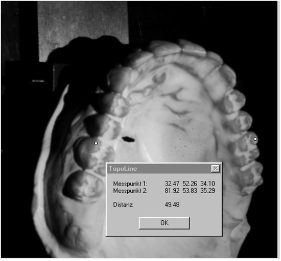 Figure 6. Measurement between teeth #16 and #26 on the reproduced model 3. Each measuring point is defined by three values in space (x-y-z axis).