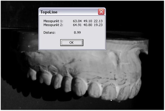 The restored dental arch was then compared with that of the control group. This comparison was carried out in collaboration with the Institute for Laser Technologies in Medicine and Metrology at the University of Ulm using the stripe projection technique [10]. The software identifies the precise location of the projected stripes in the captured images. This often involves techniques like edge detection (e.g., using the Sobel filter), Gaussian filtering, or other specialized algorithms. Then, it determines the disparity (shift or offset) of the stripes between the projected pattern and the captured image, which is directly related to the depth of the object. Using the disparity information and camera calibration data, the software reconstructs a 3D point cloud representing the object’s surface [11]. This technique relies on optical triangulation, where a camera captures the distorted stripe pattern, and the geometry of the projection and camera set-up is used to calculate the 3D coordinates of points on the object’s surface. The striped image can be generated using a special software program developed by that institute, which allows the determination of the x/y/z coordinates and measurement of the distances between two selected points [12].