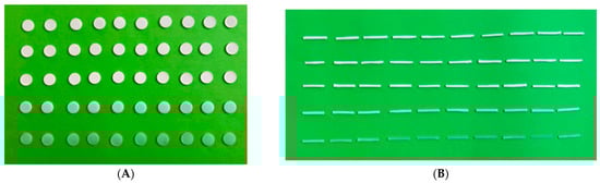 Specimen fabrication for color stability tests. (A) Fifty (50) circular discs (Ø20 × 2 mm) for colorimeter device and visual examination tests, (B) fifty (50) rectangular samples (40 × 4 × 0.5 mm) for spectrophotometer device test.