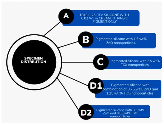 Flow chart shows specimen distribution and preparation. Group A: Teksil-25 RTV silicone with 0.02 wt% cream intrinsic pigment only. Group B: Pigmented silicone with 1.5 wt% ZnO nanoparticles. Group C: Pigmented silicone with 2.5 wt% TiO2 nanoparticles. Group D1: Pigmented silicone with 0.75 wt% ZnO and 1.25 wt% TiO2 nanoparticles. Group D2: Pigmented silicone with 0.5 wt% ZnO and 0.83 wt% TiO2 nanoparticles.