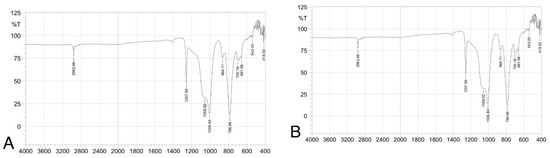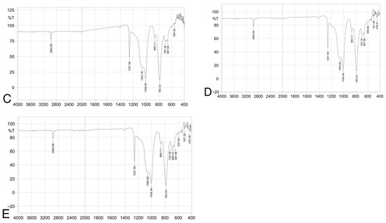 (ATR-FTIR) spectra of silicone elastomer groups: (A) control, (B) 1.5 wt% ZnO, (C) 2.5 wt% TiO2, (D) 0.75 wt% ZnO + 1.25 wt% TiO2, and (E) 0.5 wt% ZnO + 0.83 wt% TiO2. Spectra confirm preservation of characteristic peaks (e.g., Si–O–Si, CH3), indicating no structural alteration due to nanoparticle addition.