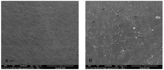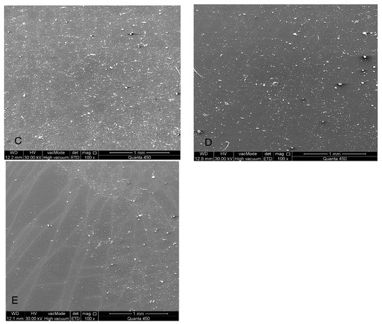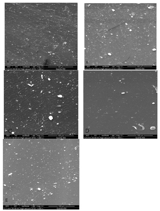 (SEM) images at 100× magnification of maxillofacial silicone specimens: (A) Control (pigmented silicone only, no nanoparticles), (B) 1.5 wt% ZnO, (C) 2.5 wt% TiO2, (D) 0.75 wt% ZnO + 1.25 wt% TiO2 (Group D1), and (E) 0.5 wt% ZnO + 0.83 wt% TiO2 (Group D2). SEM images reveal surface morphology and nanoparticle distribution. Image A displays a smooth surface, while images (B–E) show increasing surface roughness and fine nanoparticle dispersion across the silicone matrix.