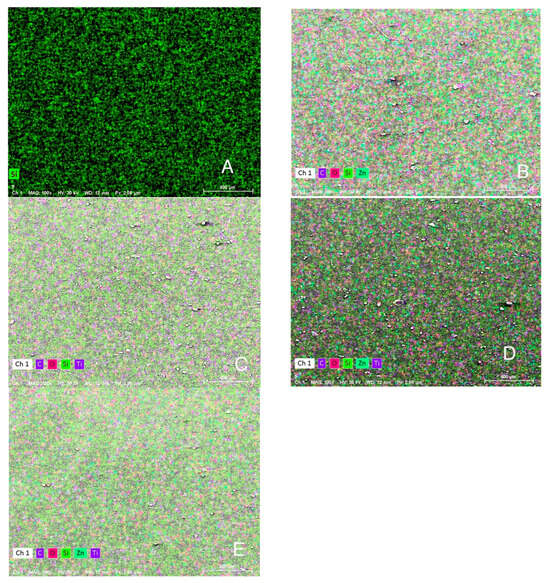 (EDS) Elemental mapping images (A) Control (pigmented silicone only, no nanoparticles), (B) 1.5 wt% ZnO, (C) 2.5 wt% TiO2, (D) 0.75 wt% ZnO + 1.25 wt% TiO2 (Group D1), and (E) 0.5 wt% ZnO + 0.83 wt% TiO2 (Group D2). EDS mapping images showing the distribution of major elements: silicon (green), carbon (magenta), oxygen (red), zinc (cyan), and titanium (blue). Image A shows no nanoparticle presence, while images (B–E) demonstrate increasing levels of Zn and Ti with homogeneous dispersion across the silicone surface.