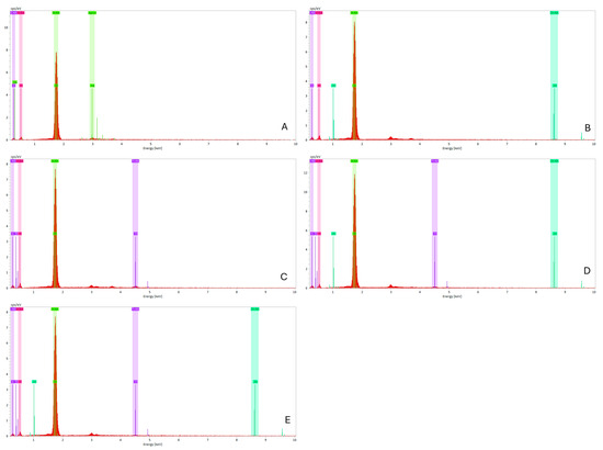 (EDS) spectra graphs of maxillofacial silicone specimens. (A) Control (clear silicone, no nanoparticles), (B) 1.5 wt% ZnO, (C) 2.5 wt% TiO2, (D) 0.75 wt% ZnO + 1.25 wt% TiO2 (Group D1), and (E) 0.5 wt% ZnO + 0.83 wt% TiO2 (Group D2). The elemental peaks for Zn, Ti, Si, C, and O confirm the incorporation of nanoparticles without altering the base matrix.