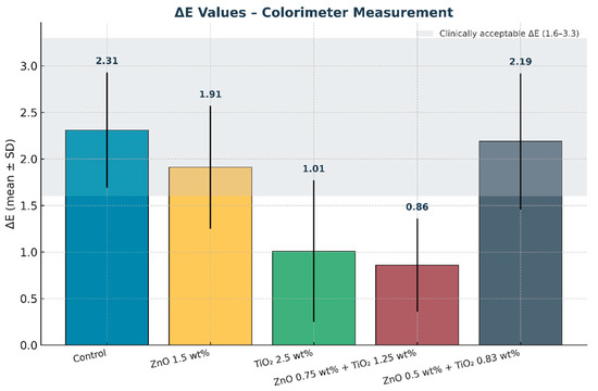Mean color difference (ΔE) values of maxillofacial silicone elastomers measured with a colorimeter. Error bars represent standard deviation (SD). The shaded grey band indicates the clinically acceptable ΔE range (1.6–3.3). The combined nanoparticle group (0.75 wt% ZnO + 1.25 wt% TiO2) exhibited the lowest ΔE values, demonstrating superior color stability after artificial aging.