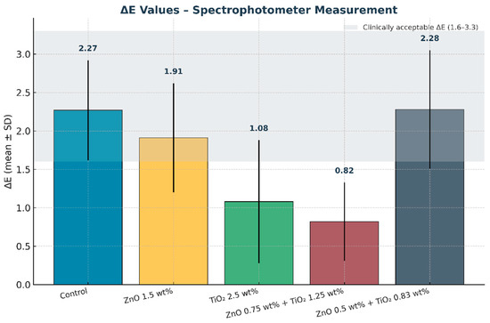 Mean color change values (ΔE) of maxillofacial silicone elastomers measured with a spectrophotometer. Error bars represent standard deviation (SD). The shaded grey band indicates the clinically acceptable ΔE range (1.6–3.3). The combined nanoparticle group (0.75 wt% ZnO + 1.25 wt% TiO2) exhibited the lowest ΔE, confirming superior color stability after artificial aging.