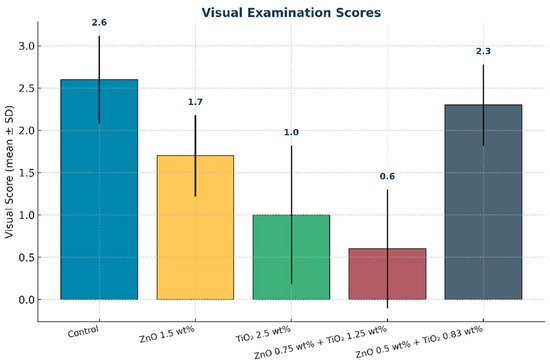 Mean visual examination scores of maxillofacial silicone elastomers after artificial aging. Error bars represent standard deviation (SD). The combined nanoparticle group (0.75 wt% ZnO + 1.25 wt% TiO2) exhibited the lowest scores, reflecting the greatest visual color stability.