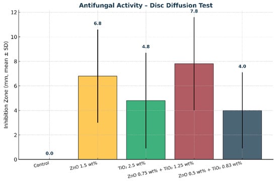 Mean inhibition zone diameters (mm) of maxillofacial silicone specimens obtained from the disc diffusion test. Error bars represent standard deviation (SD). The combined nanoparticle group (0.75 wt% ZnO + 1.25 wt% TiO2) demonstrated the largest inhibition zone, indicating the strongest antifungal activity compared with the control and single nanoparticle groups.