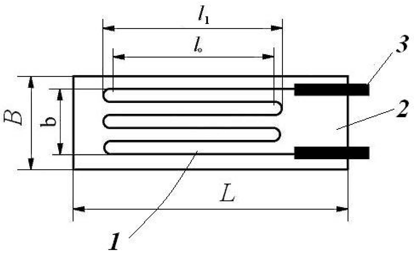 Figure 1. A bonded-wire strain gauge: L—the total length of the gauge; B—the total width of the gauge; l 0 —the active length of the wire serpentine without the loop length; l 1 —the length of the wire serpentine; b—the width of the wire serpentine; 1—the strain-sensing element (here: a metal wire); 2—carrier element; 3—terminals for lead wire connections [37,38,39,40,41,42,43].