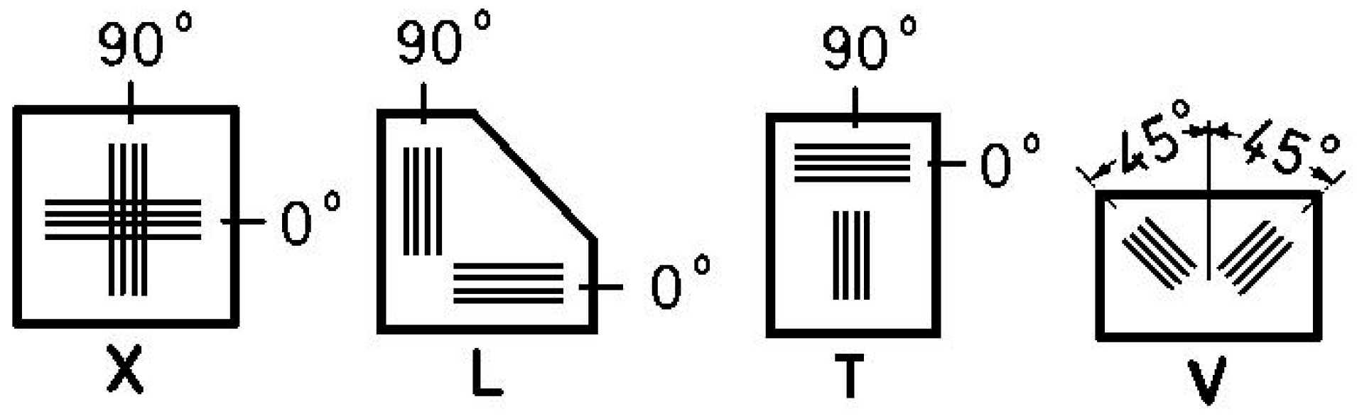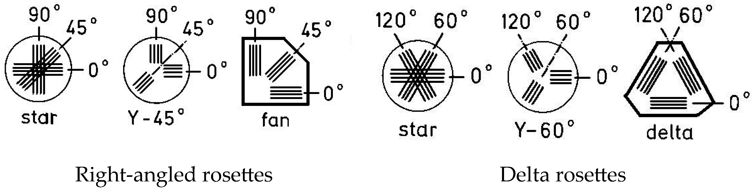 In the general case of plane stress/strain states, without knowing the dispositions of the main directions, three-element rosettes are used. There are two main categories, i.e., rectangular (right-angled rosettes) and delta rosettes (Figure 3), which are recommended for the direct testing of human bones.