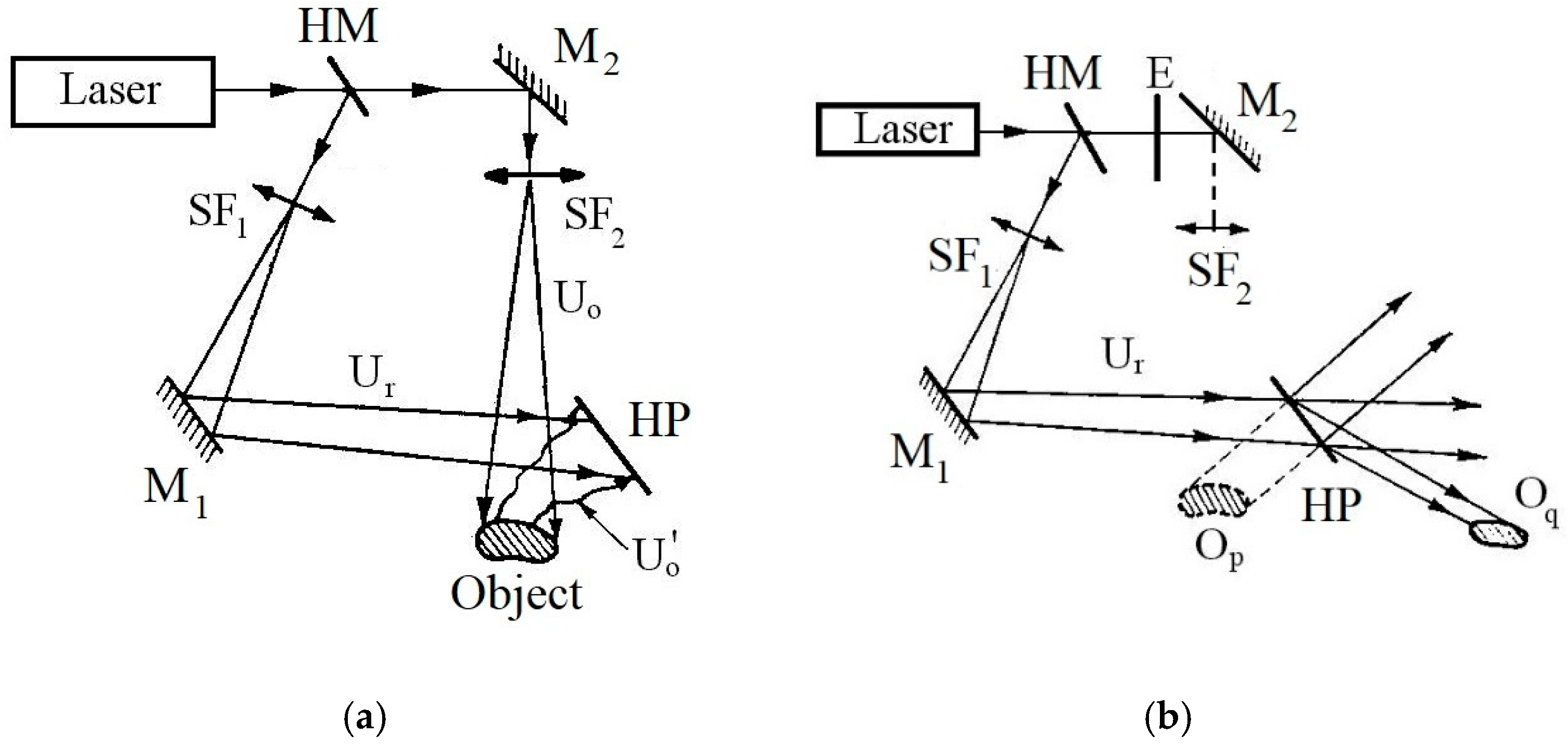 To the best of the authors’ knowledge, currently, the most precise experimental method is Holographic Interferometry (HI) [40,42,50,51]. It represents a particularly efficient combination of Optical Interferometry with Classical Holography (discovered in 1949 by Dennis Gábor), using a laser beam (intense, coherent, and monochromatic) as a light source. Depending on the distances between the observer, the holographic plate (HP), and the tested object, we distinguish Fresnel-type holograms when these distances are of the same order of magnitude or Fraunhofer–Fourier-type holograms when the object is at a much greater distance from the subject. In current technical measurements using HI, the Fresnel types are used (Figure 4a). The laser source emits an intense, coherent, monochromatic light beam with a diameter of approximately 1.5–2.0 mm. This beam is divided into two parts at the half-mirror (HM). These two parts have intensities that depend on the application; they vary with a ratio from 1:1 to 1:5 using the optical characteristics of the HM. The reflected wave, which is called the reference wave U r here, expands at the spatial filter SF1, becoming a broadened and filtered wave, so it has a perfect Gaussian distribution. By means of the mirror M1 (or, if necessary, a set of several mirrors), U r , which has been widened and has an increasingly larger diameter along the path travelled, directly reaches the HP, which it illuminates entirely. The HP is a high-resolution photosensitive plate of 7000–9000 lines/mm. During this time, with the help of the M2 mirror of the SF2 spatial filter, the wave that directly crosses HM, that is, the transmitted wave, called the object wave U o here, is widened and filtered when it reaches the surface of the object studied, which it illuminates entirely (obviously, only the surface visible to the Uo beam). This studied object must have a semi-matte and relatively rough surface so that each of its points functions as a secondary light source. Thus, the light incident on this surface, after reflecting from these points back into space, partially arrives at the HP. At the HP level, interference with U r occurs, as it is in phase (i.e., oscillates in phase) with Uo. This interference leads to the formation of a holographic image, i.e., a virtual 3D image of the tested object. To reconstruct this image (Figure 4b), an E screen is interposed in front of Uo, and even if the initial (real) object Op has been removed, its virtual 3D image, i.e., Oq, becomes visible to the observer behind the HP.