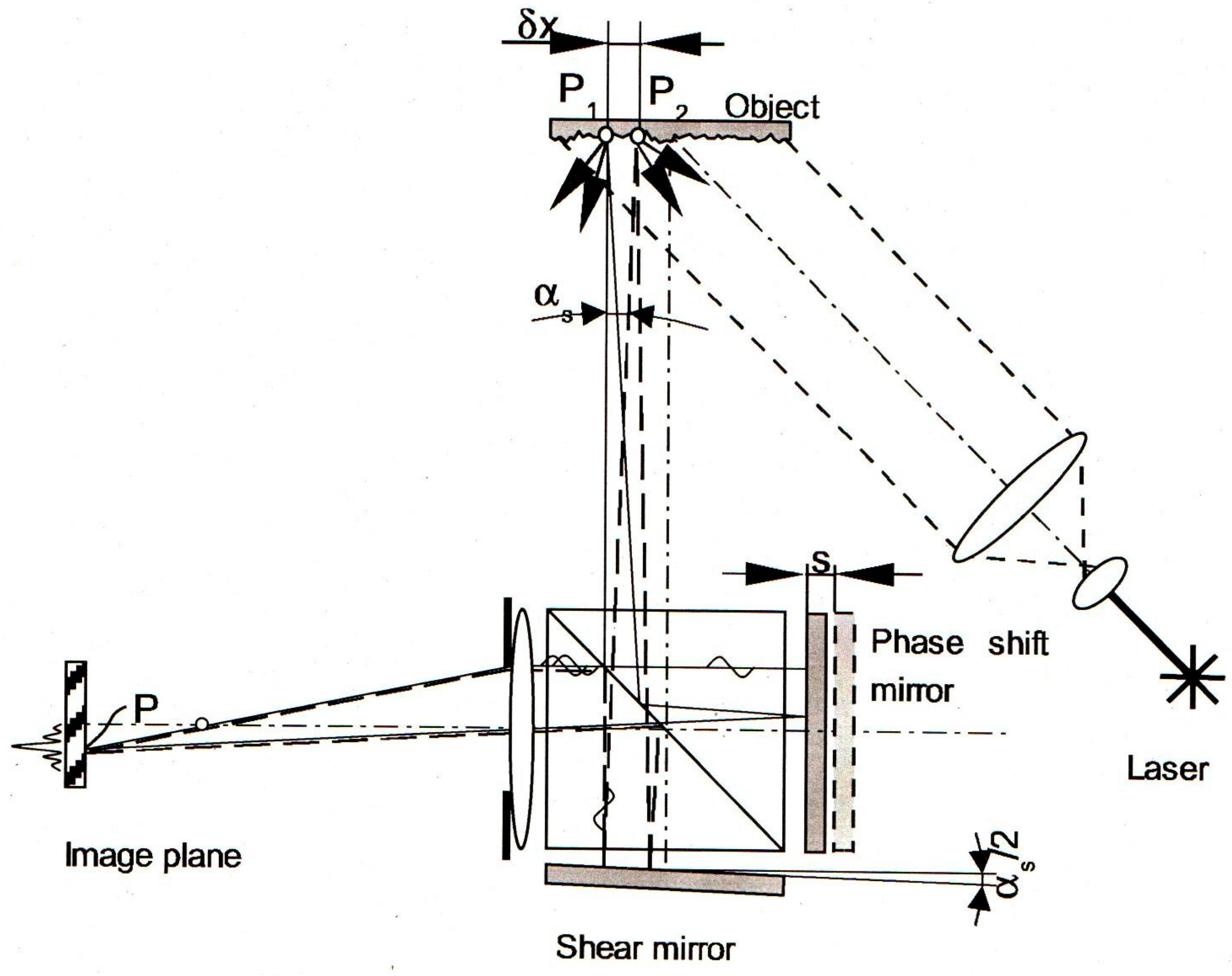 There are two or four special laser diodes, which assure a coherent, monochromatic, powerful lighting of the tested object; in Figure 6, only one of them is represented. From the diffusely scattering surface of the illuminated object, each surface point acts as a secondary light source, which reflects the incoming light (in every direction). Thus, a part of the incident light will arrive at the CCD camera, where, in the focal plane of the camera, one obtains the image of the object. In this sense, the light passes through the Michelson interferometer, which consists of a divisor cube and two mirrors (shear mirror and phase shift mirror). By tilting the shear mirror with a small angle of α s / 2 , two points on the surface of the object (P1 and P2) will be superposed at a single point P of the focal plane. Therefore, the corresponding light beam paths interfere on the focal plane of the camera (in the image plane). The corresponding shear amount