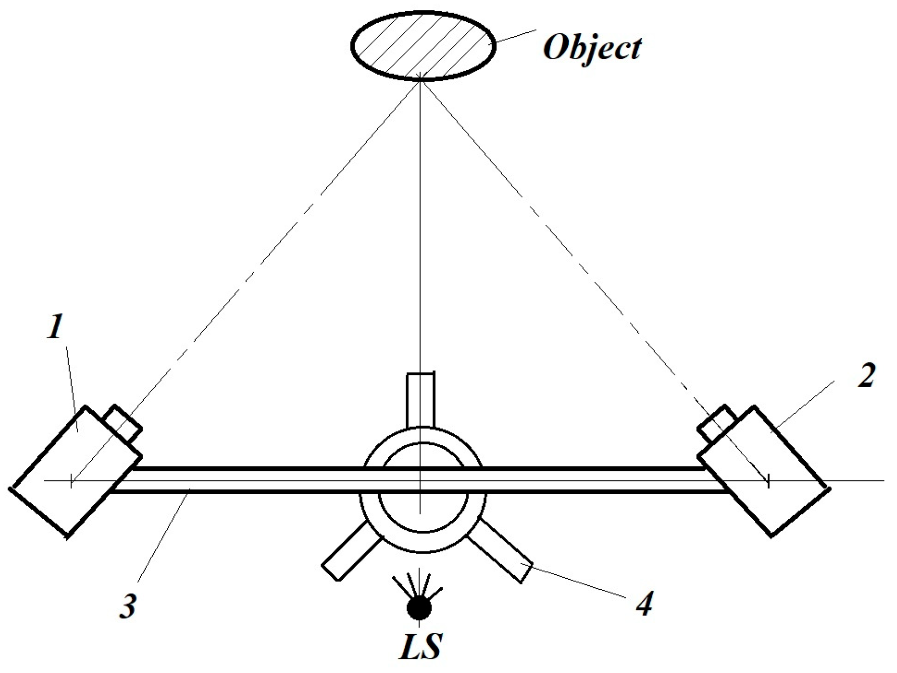 Figure 7. The principle schema of a VIC/DIC 3D system: 1,2-cameras, 3-rigid aluminum bar, 4-stable tripod [58].