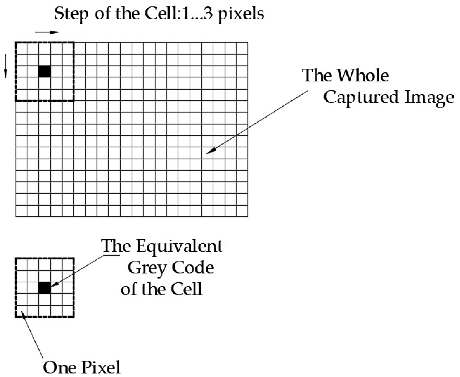 This system, intended for monitoring the 3D fields of displacements, deformations, and strains, consists of the following main components. There are two CCD cameras (1 and 2) that are symmetrically arranged with respect to the normal to the surface of the studied object. The CCD cameras are mounted on a rigid aluminum bar (3), which, in turn, is fixed on an equally stable tripod (4), ensuring the good stability of this optical system. The uniform illumination of the surface of the tested object, provided by a natural or conventional artificial SL light source, contributes to high-quality image capture. The surface of the object is painted with a matte black ground (white or black), on which speckles (black or white to ensure a good contrast with the background) are applied. The applied speckles have a random shape, size, and distribution. In advance of the measurements, by placing and rotating a special plate in the plane of the object to be analyzed, one performs the calibration of the VIC system. After calibration, a set of images (left and right) is captured with the CCD cameras for the unloaded (or preloaded) state of the object, followed by the actual acquisition, with a preset (given/desired) frequency, of image sequences during its loading. Each acquired image (left and right) will have a pixel size of 5.5 = 25. The software offers the possibility of selection of the area of interest (AOI), the subset (primarily cell) dimensions (here, 5.5 = 25 pixels), and the step size for moving/translating the subset in the horizontal and vertical directions to analyze (to sweep) the entire image of 5.5 = 25 n × m pixels, as shown in Figure 8. The software for this subset establishes/determines a unique gray code that is correlated to its median pixel’s high-accuracy 3D positioning (marked in black in the figure). By analyzing the whole image (by sweeping it with a pre-selected step—a number of pixels—without leaving the previous subset entirely), each subset also receives a nominated (unique) high-accuracy 3D positioning and a unique gray code. Consequently, the software substitutes these n × m pixel images with a limited number of characteristic points of the above-mentioned subsets, which have both a unique gray code and uniquely defined high-accuracy 3D coordinates. Thus, during the loading of the object, the displacement vectors and their corresponding 3D projections of these characteristic points (of course, only from the AOI) offer not only the displacement field but also the corresponding strain field.