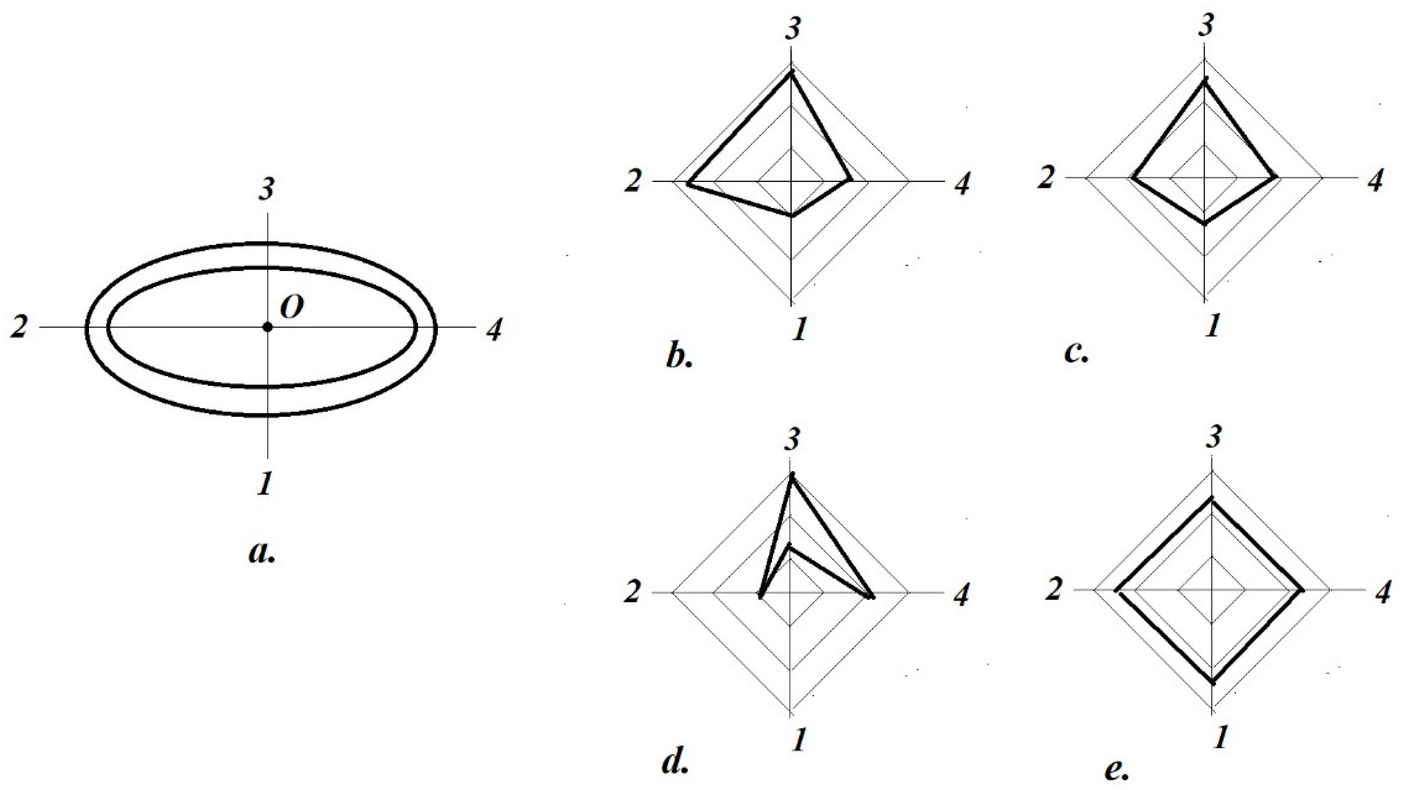 Figure 19. The principal evaluation schema: (a) the cross-section of a bone with the proposed main directions; (be) different bone fixation cases [63].