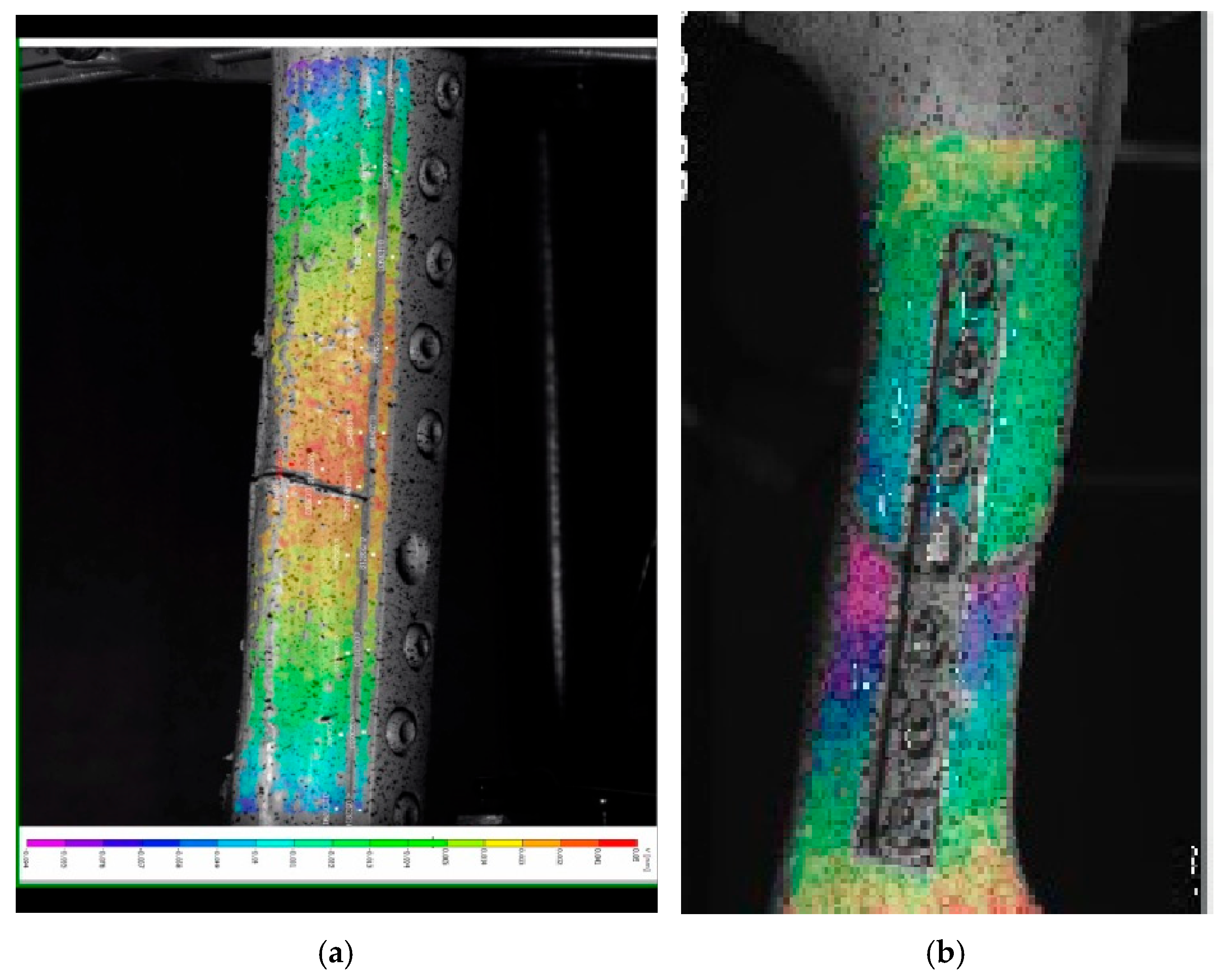 One can exclude the Moiré Fringes Method from the category of global experimental methods (full-field methods) [44,45,46]. This is because its application to in-plane deformation states, i.e., the Geometric Moiré Fringes Method, requires a relatively difficult application/fixation of the active grid (specimen grating) on human bones, mainly on the fractured ones. The other variant, i.e., the Shadow Moiré Fringes Method, is destined exclusively for out-of-plane deformation monitoring; it has useful applications in the accuracy monitoring of some dental prostheses. However, in the field of surgical problems of long human bones, the authors have no knowledge of any use.
