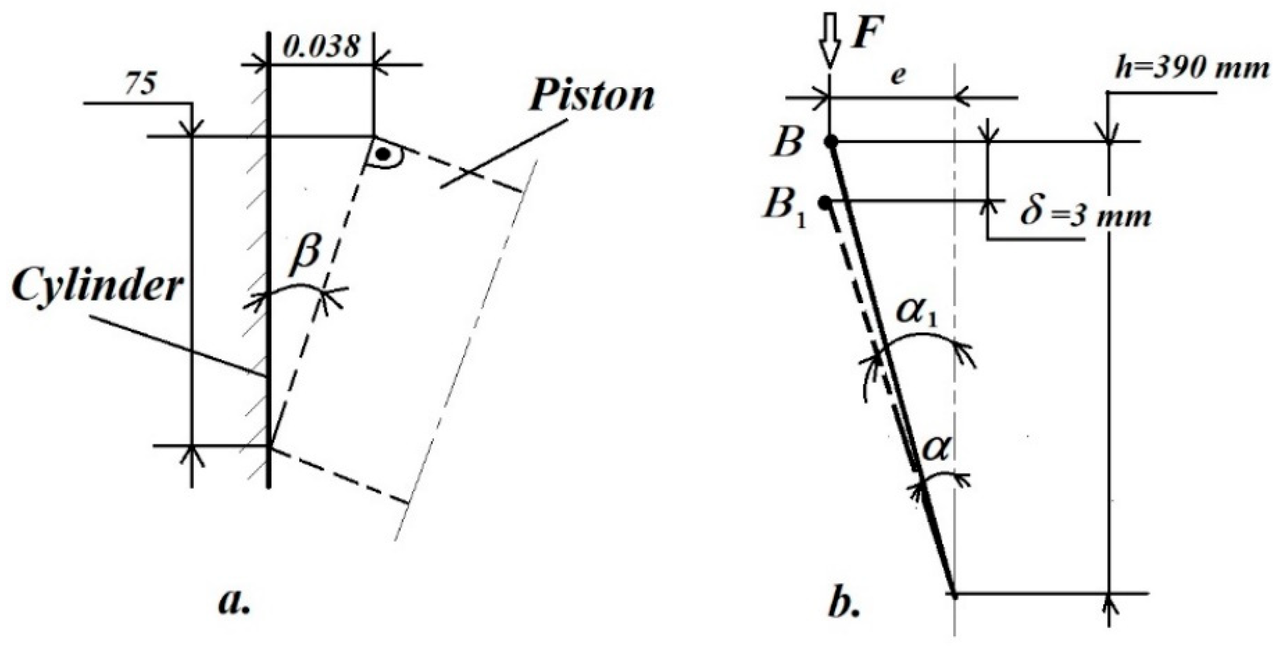 Figure 22. Test bench accuracy calculation schemes (a) dimensions of the piston; (b) eccentricity of force F.