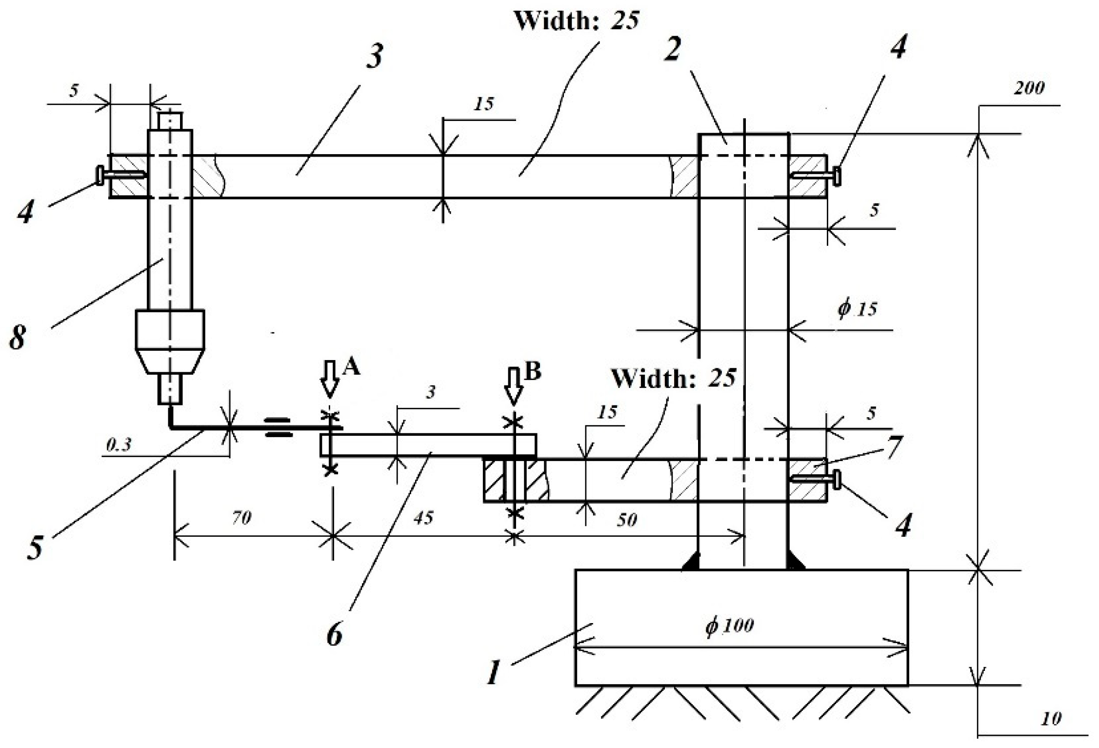 Figure 25. Calibration bench: 1—support base; 2—support column; 3—micrometer support arm; 4—fixing screw; 5—lamella with ESGs; 6—aluminum lamella support; 7—connecting piece; 8—micrometer class 0.1: A and B the level of the bores.
