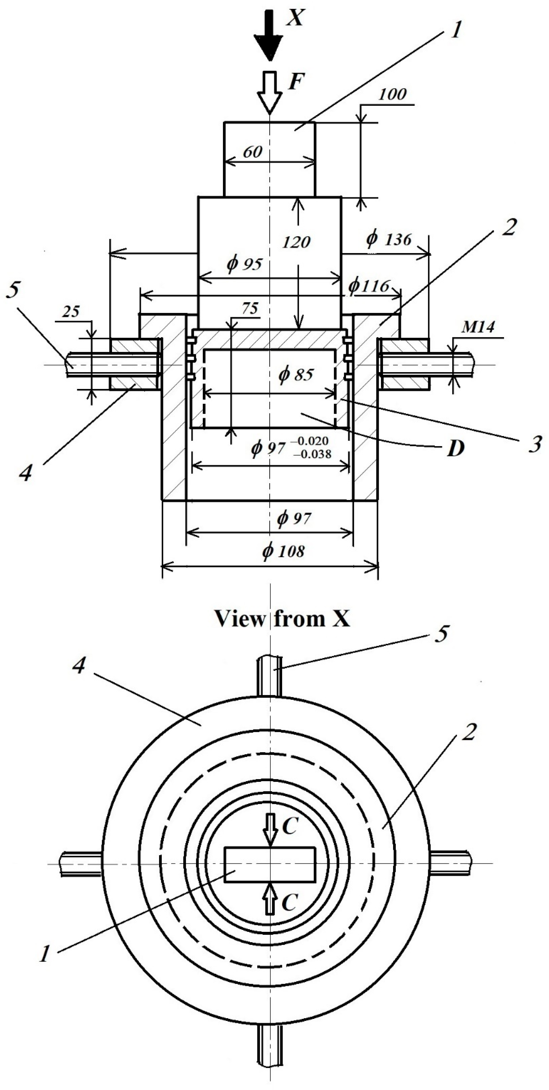 Figure 27. Upper subassembly: 1—special actuator part; 2—cylinder liner; 3—piston with three segments; 4—rigid cylinder liner fixing ring; 5—M14 fixing screws.