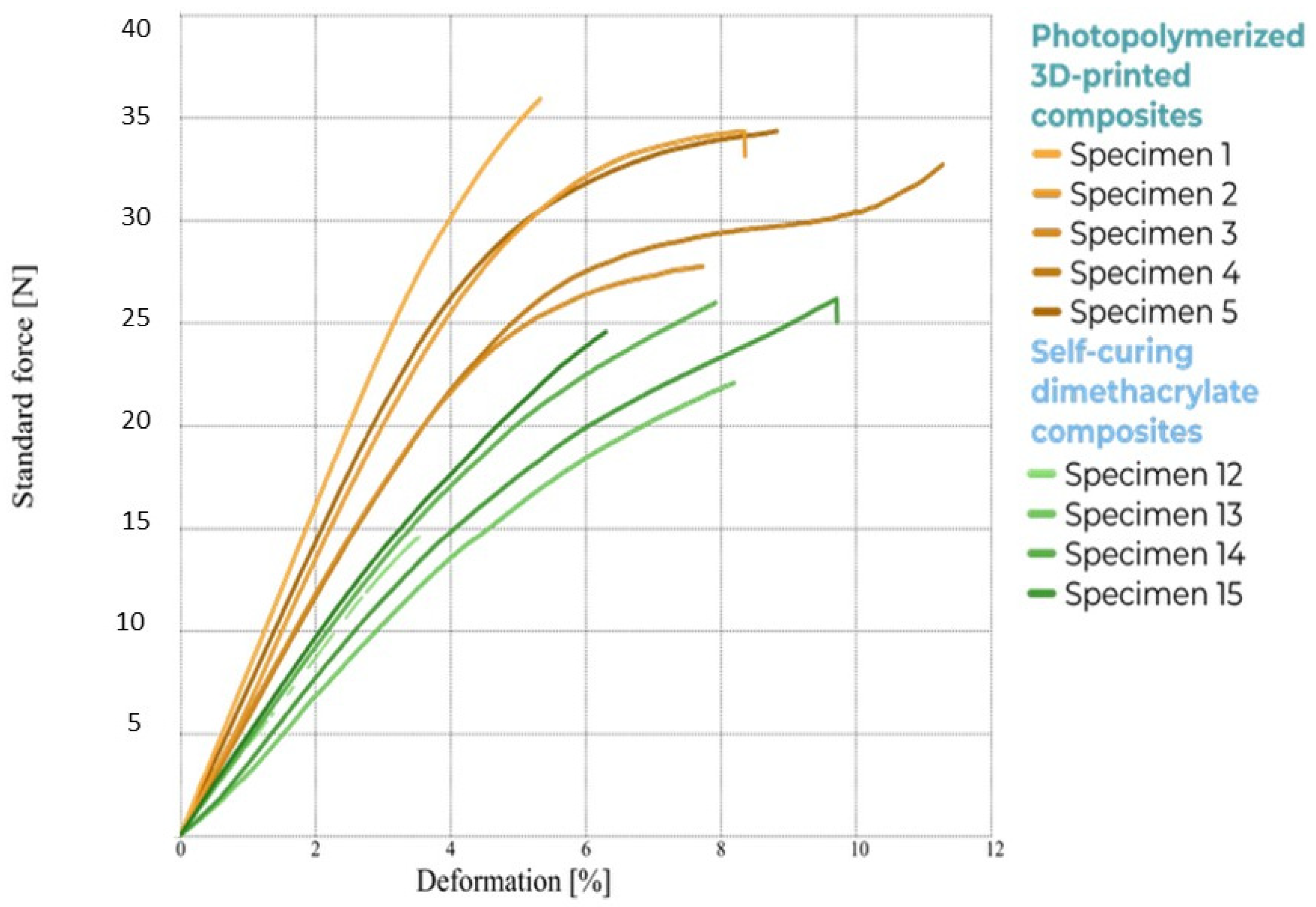 | Resin | Self-Curing Dimethacrylate Composite | Photopolymerized 3D-Printed Composite |