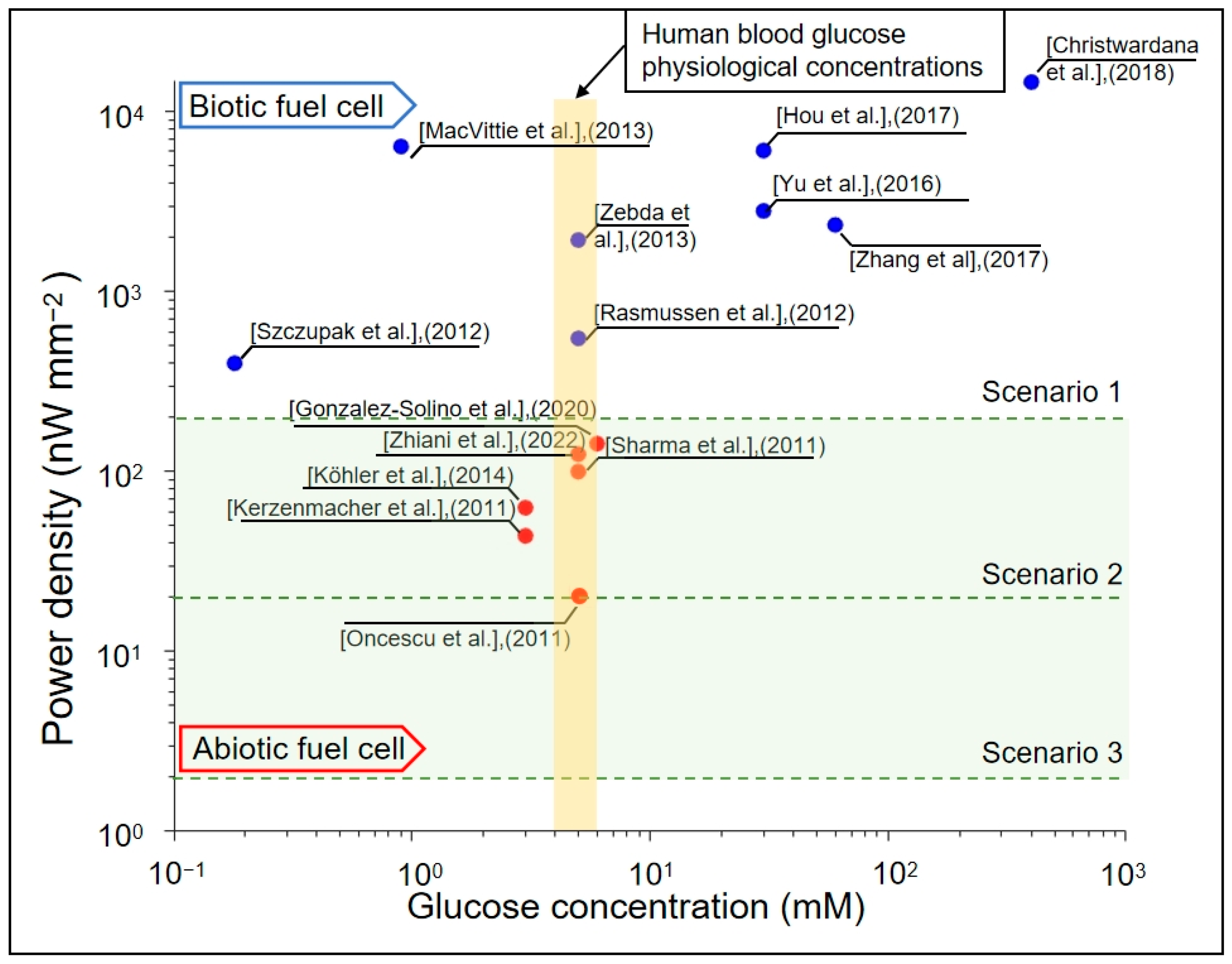 - Gonzalez-Solino, C.; Metcalfe, B.W.; Lorenzo, M.D. Power generation and autonomous glucose detection with an integrated array of abiotic fuel cells on a printed circuit board. J. Power Sources 2020, 472, 228530. [Google Scholar] [CrossRef]