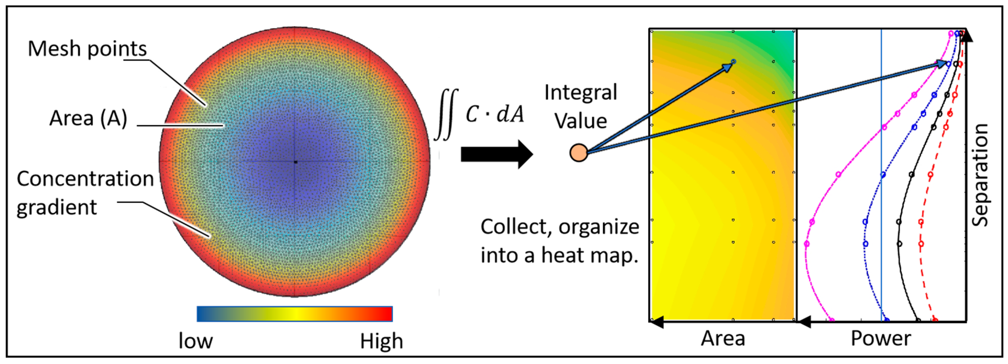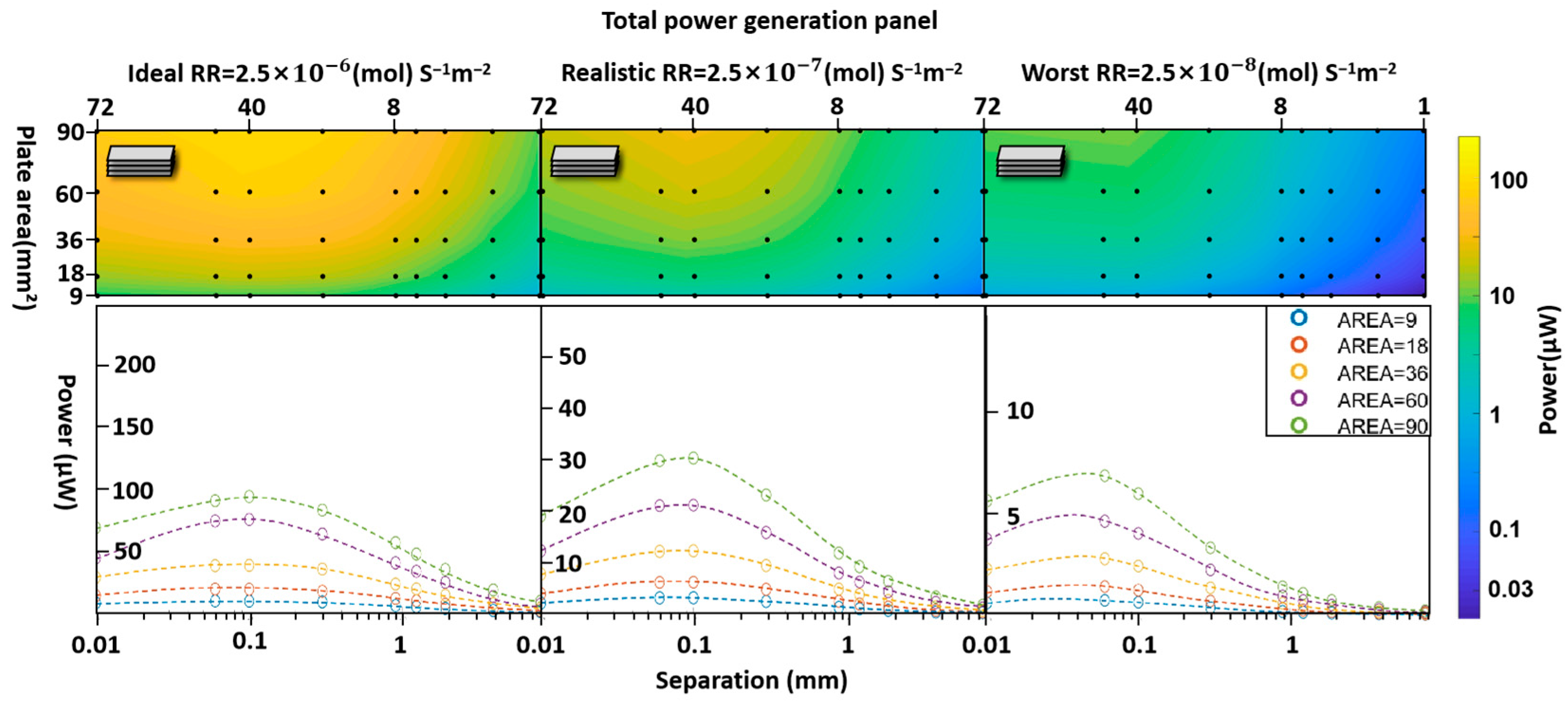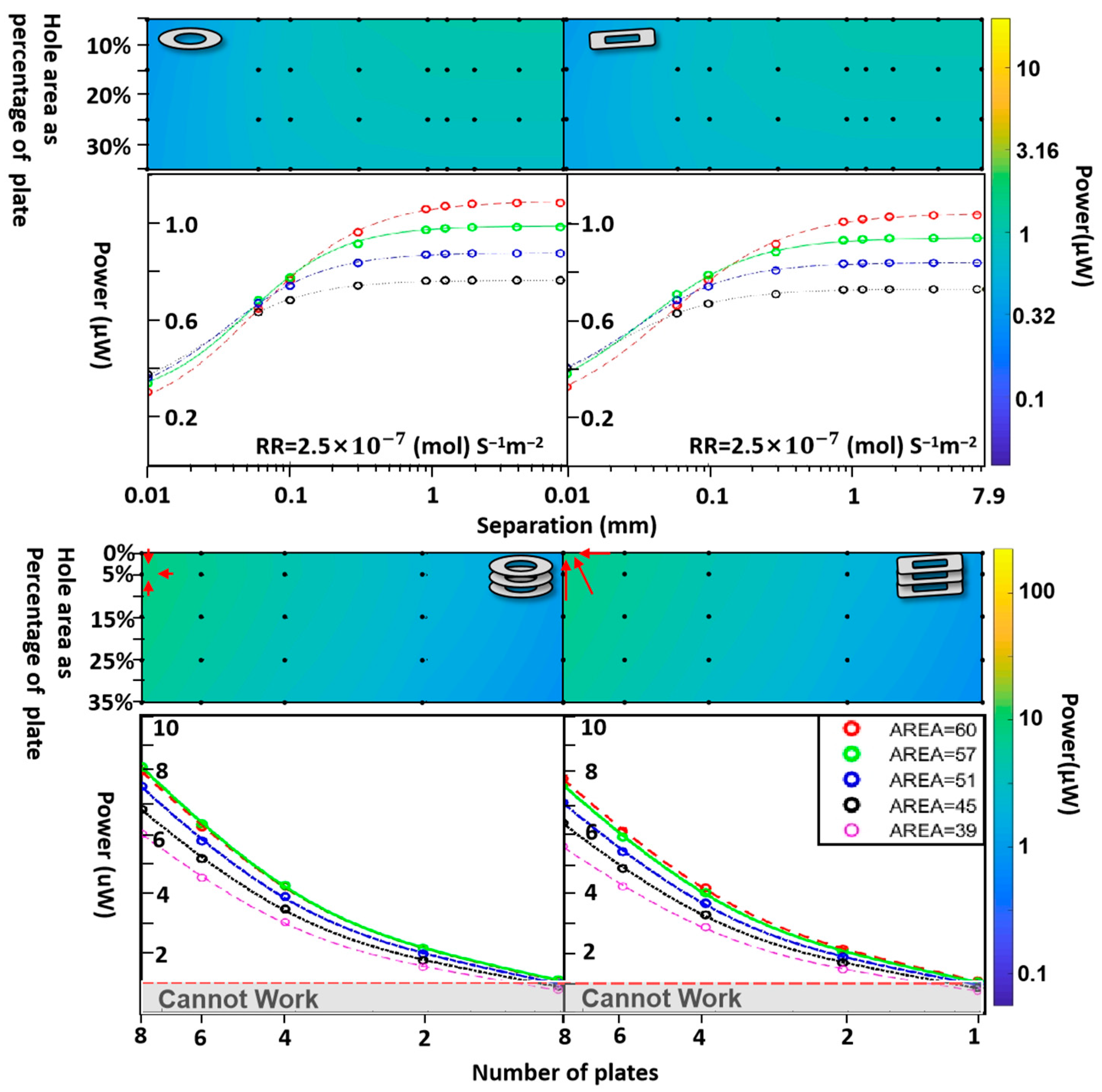 - Blood glucose typically ranges between 3.9 and 6.9 mM, while diffusion into interstitial fluid reduces availability by ~25–30%. Physiological dissolved oxygen in plasma is low (~0.05–0.1 mM), with the majority carried bound to hemoglobin (~9 mM equivalent). In highly vascularized regions, however, hemoglobin unloading continually replenishes the dissolved fraction. Accordingly, we assumed half the arterial oxygen content as an optimistic, perfusion-supported boundary condition to prevent artificial oxygen limitation and to focus on geometric effects. In less-perfused tissues, absolute power would be reduced, but the identified structural trends (optimal spacing, stacking, and geometry) remain valid. We, therefore, set fixed concentrations of 5 mMol L−1 glucose and 4.5 mMol L−1 oxygen at the boundaries of our simulation to be consistent with typical tissue fluid conditions [47,48,49,50].