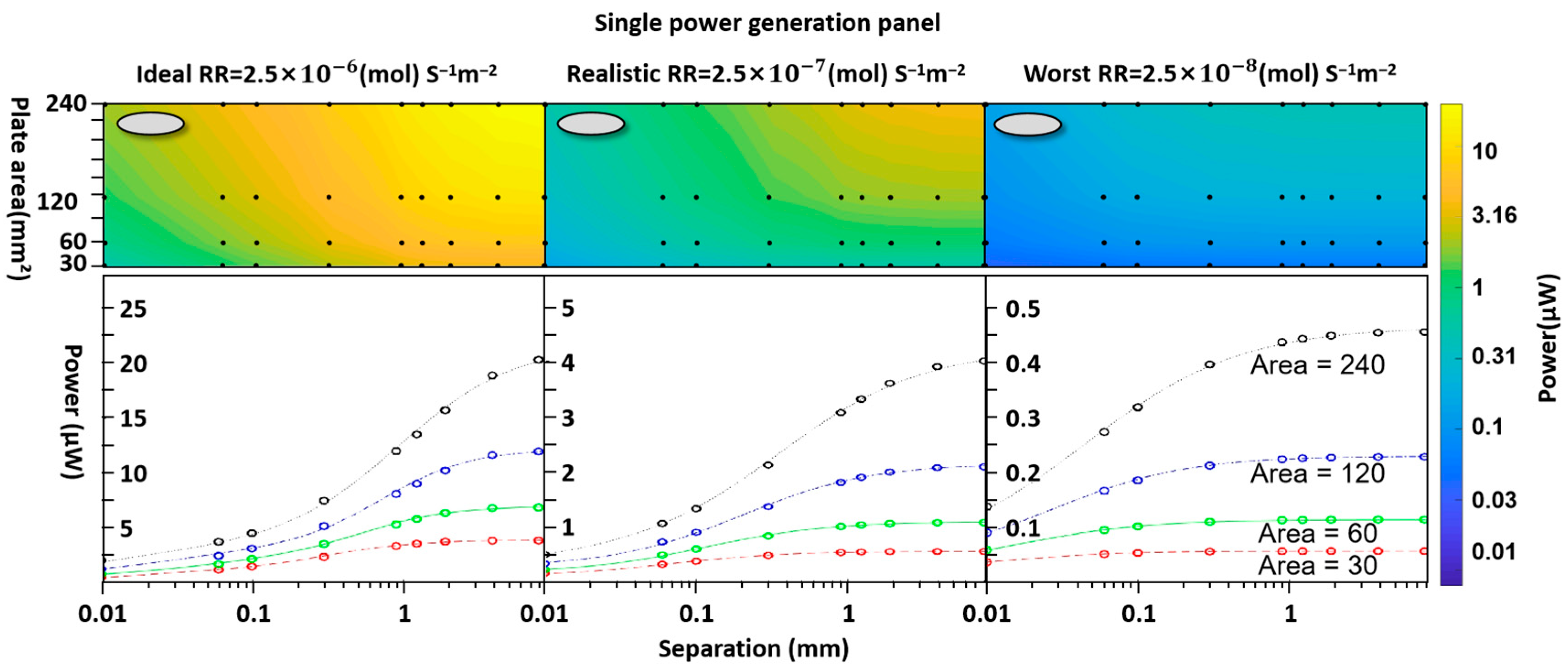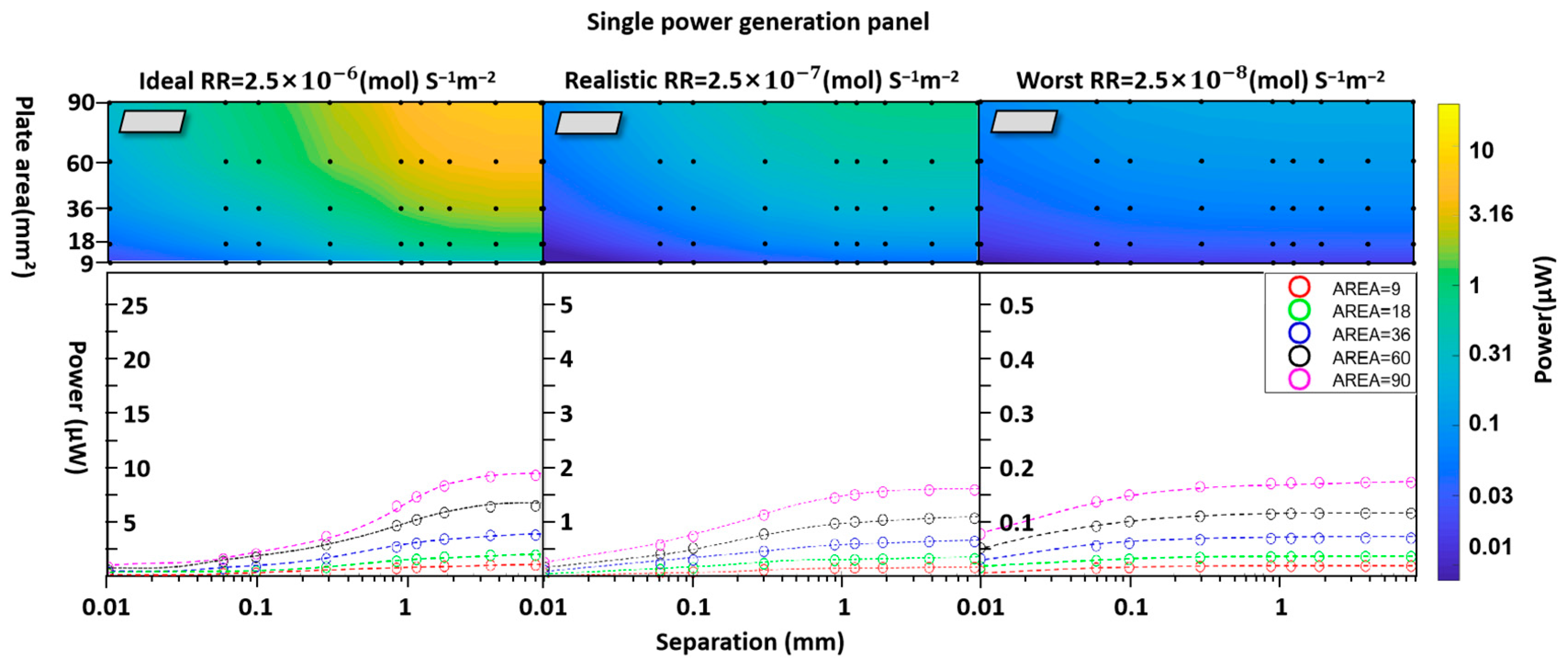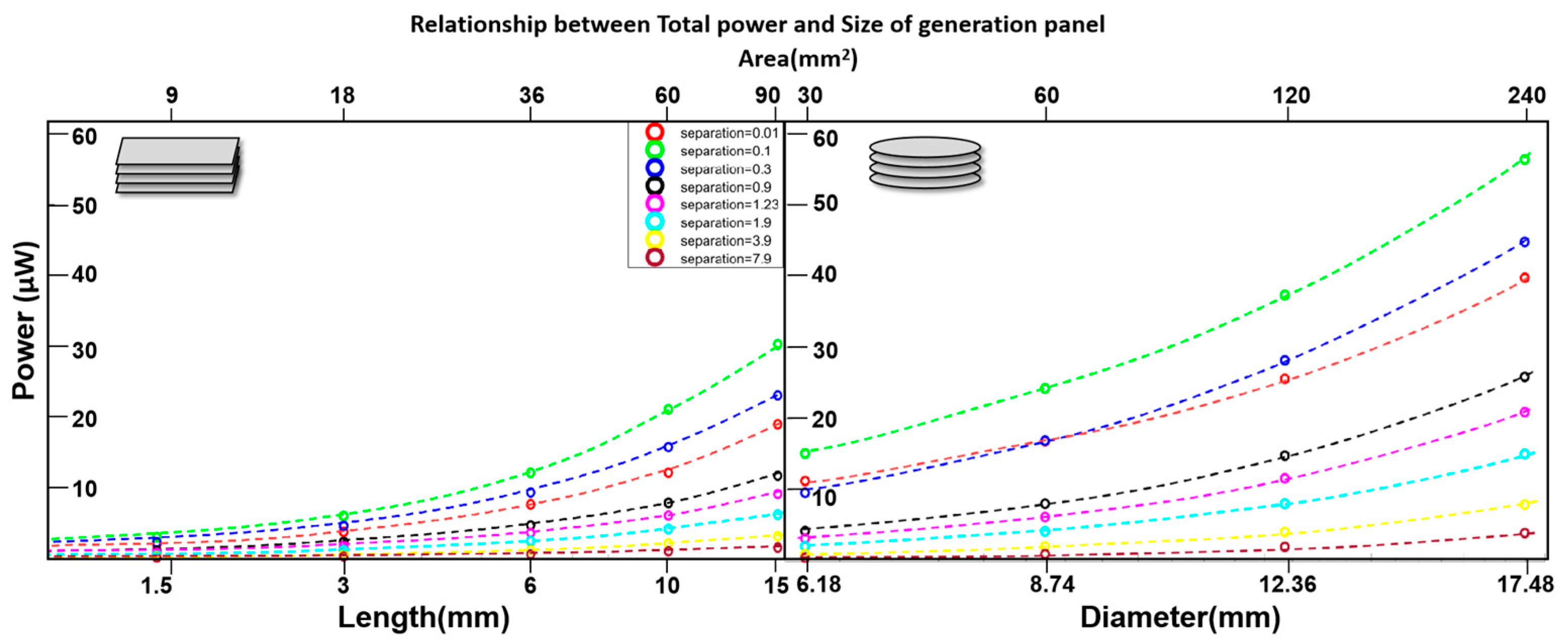 - Blood glucose typically ranges between 3.9 and 6.9 mM, while diffusion into interstitial fluid reduces availability by ~25–30%. Physiological dissolved oxygen in plasma is low (~0.05–0.1 mM), with the majority carried bound to hemoglobin (~9 mM equivalent). In highly vascularized regions, however, hemoglobin unloading continually replenishes the dissolved fraction. Accordingly, we assumed half the arterial oxygen content as an optimistic, perfusion-supported boundary condition to prevent artificial oxygen limitation and to focus on geometric effects. In less-perfused tissues, absolute power would be reduced, but the identified structural trends (optimal spacing, stacking, and geometry) remain valid. We, therefore, set fixed concentrations of 5 mMol L−1 glucose and 4.5 mMol L−1 oxygen at the boundaries of our simulation to be consistent with typical tissue fluid conditions [47,48,49,50].