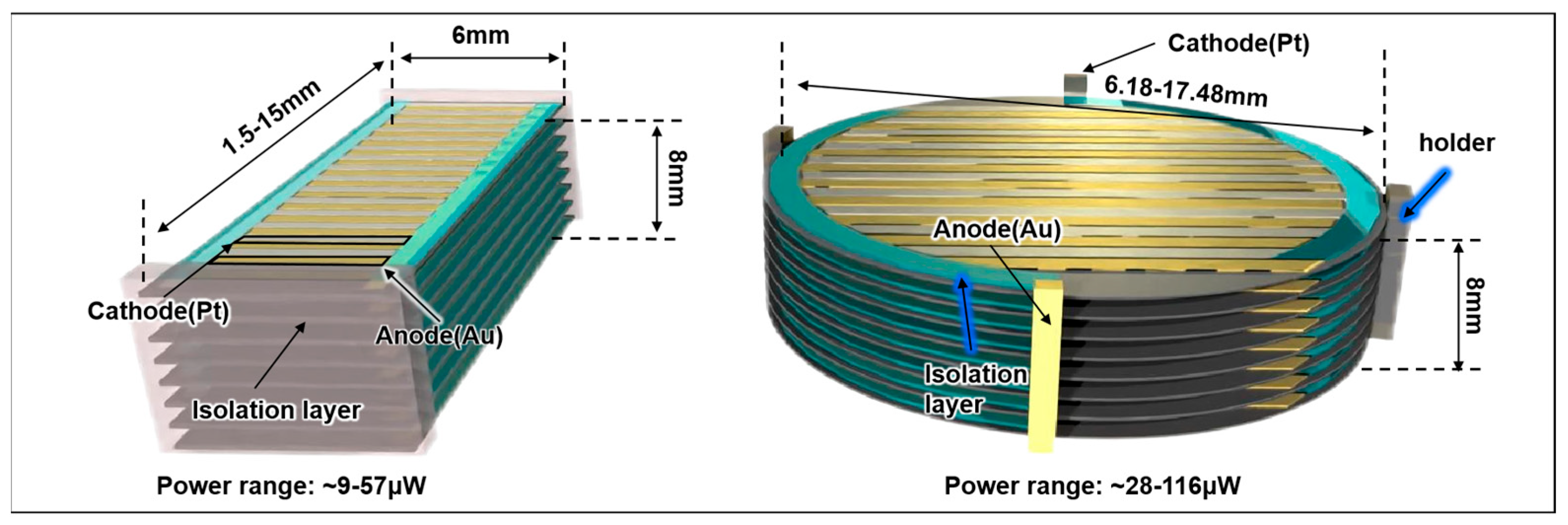 - Drake, R.F.; Kusserow, B.K.; Messinger, S.; Matsuda, S. A tissue implantable fuel cell power supply. ASAIO J. 1970, 16, 199–205. [Google Scholar]