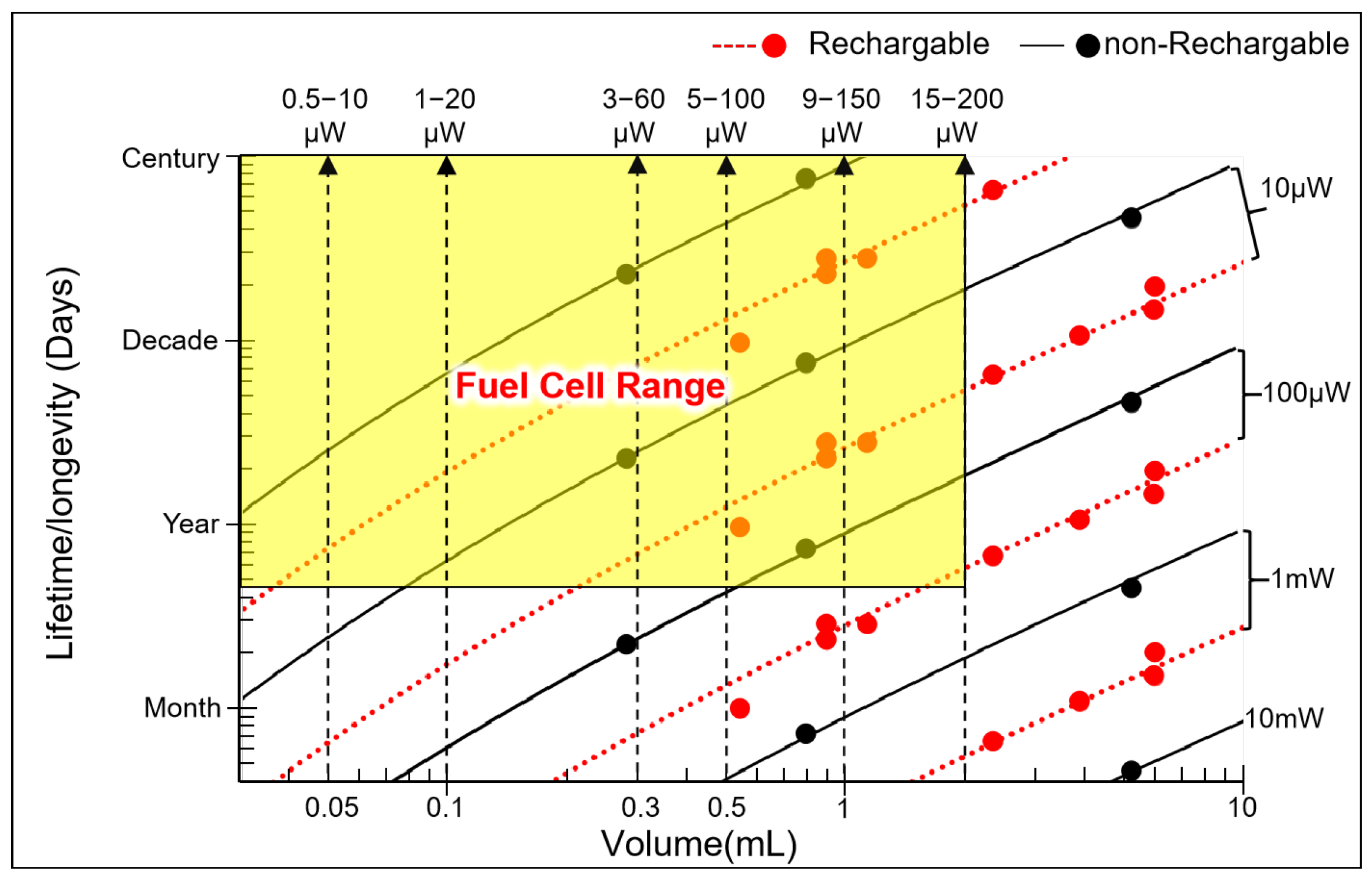 | Implant | Power Range (μW) | Lifetime with a 10 mL Battery | Lifetime with a 1 mL Battery | Lifetime with a 50 µL Battery | Refs. |