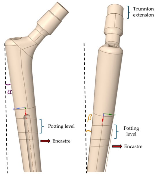 For the computation of results, the reference model adopts the standard orientation, with and equal to 10° and 9°, respectively. Since several studies in the literature apply the load axially along the neck, this configuration was also tested, even though it diverges significantly from the standard guidelines.