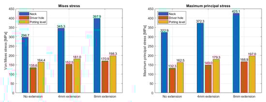 As clearly expected, increasing the trunnion extension leads to higher stress values in all regions. Regarding the Maximum Principal stress, the trend is nearly linear, with increases of approximately 13%, 11%, and 9% for the neck, driver hole, and potting level, respectively. Notably, the neck is the most sensitive region, showing a substantial increase of about 24% when comparing the 8 mm extension to the no-extension case. These percentage changes refer to the Maximum Principal stress, but the Von Mises stress follows a similar trend.