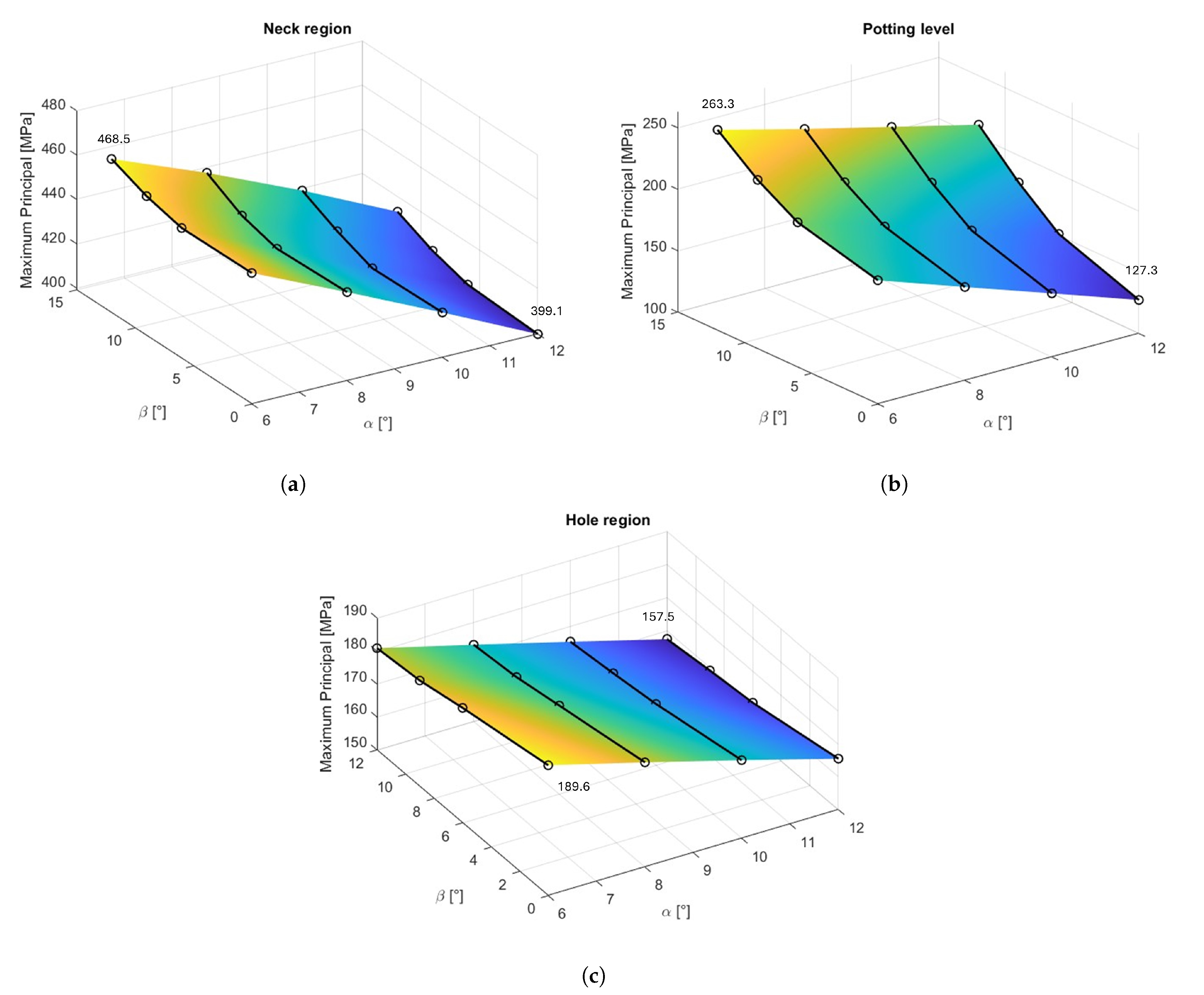 ) are alternately held constant, allowing the dependence of the Maximum Principal stress on each angle to be analyzed independently across all regions. For example, by fixing