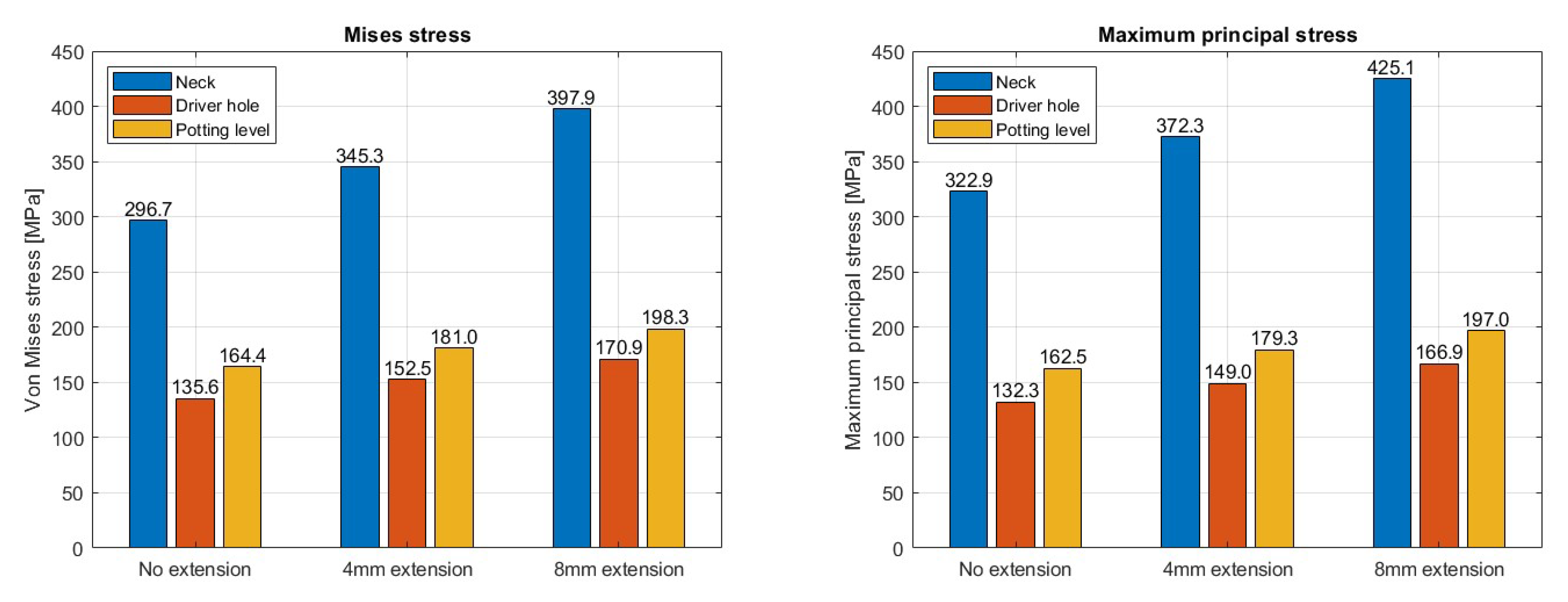 As clearly expected, increasing the trunnion extension leads to higher stress values in all regions. Regarding the Maximum Principal stress, the trend is nearly linear, with increases of approximately 13%, 11%, and 9% for the neck, driver hole, and potting level, respectively. Notably, the neck is the most sensitive region, showing a substantial increase of about 24% when comparing the 8 mm extension to the no-extension case. These percentage changes refer to the Maximum Principal stress, but the Von Mises stress follows a similar trend.