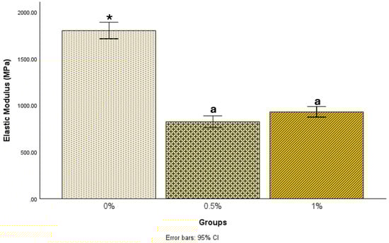 There was a statistically significant difference in elastic modulus among the groups [F (2, 68) = 241.97, p < 0.001]. Post hoc comparisons using the Tukey HSD test showed that the mean elastic modulus for the 0% group (1801.78 ± 213.41) was statistically significantly (p < 0.001) higher than the 0.5% group (822.35 ± 151.50) and the 1% group (930.29 ± 130.37), as shown in Figure 2 and Table 3 and Table 4. The 0.5% and 1% groups were not statistically significantly different.