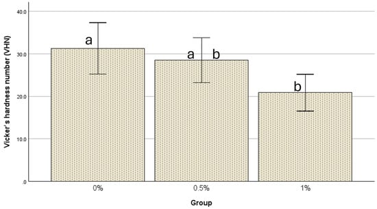 The Vickers hardness (VH) tester (Shimadzu HMV-G31DT; Shimadzu Scientific Instruments, Columbia, MD, USA) was used for the evaluation VH of the specimens as described in a previous study []. Each of the 22 samples from one group (0%, 0.5%, 1.0% organoselenium) was secured and placed on the microhardness tester. Three indentations were made on each sample at different sites along the diametrical line (center and left and right ends) using a Vicker’s diamond under a 50 g load applied for 15 s. Then the dimensions of each indentation were measured using the HMV-G software for HMV-G31 series (Shimadzu Scientific Instruments, Columbia, MD, USA) and averaged for each sample [,].