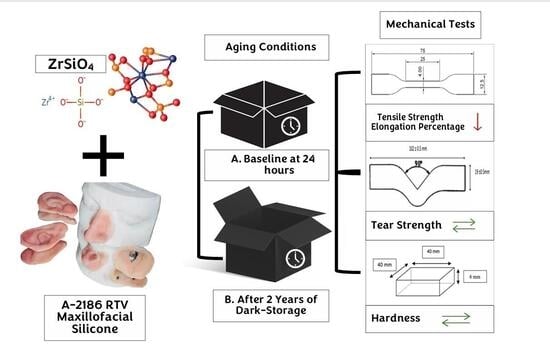 - Nobrega, A.S.; Andreotti, A.M.; Moreno, A.; Sinhoreti, M.A.C.; Dos Santos, D.M.; Goiato, M.C. Influence of Adding Nanoparticles on the Hardness, Tear Strength, and Permanent Deformation of Facial Silicone Subjected to Accelerated Aging. J. Prosthet. Dent. 2016, 116, 623–629.e1. [Google Scholar] [CrossRef] [PubMed]