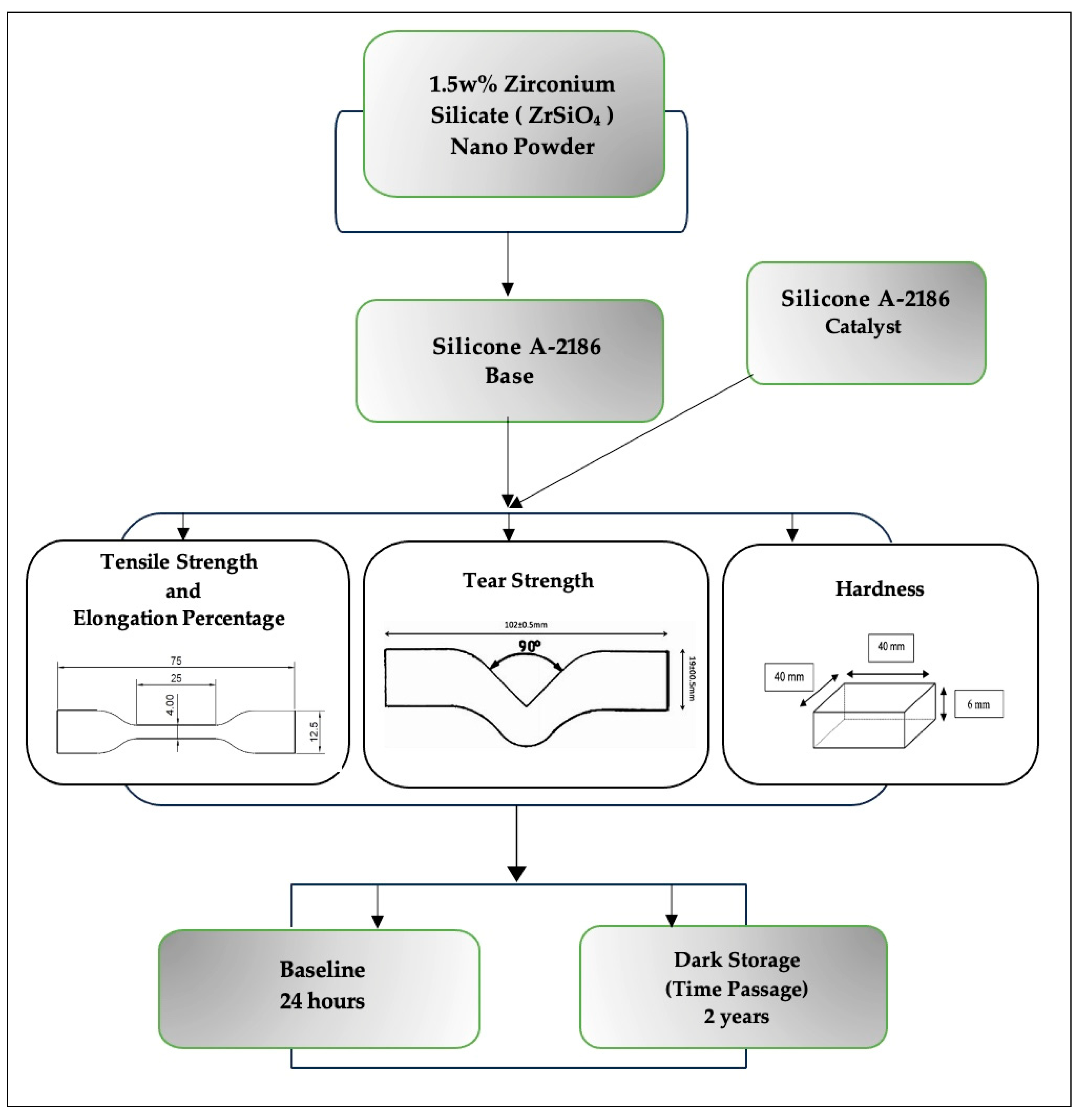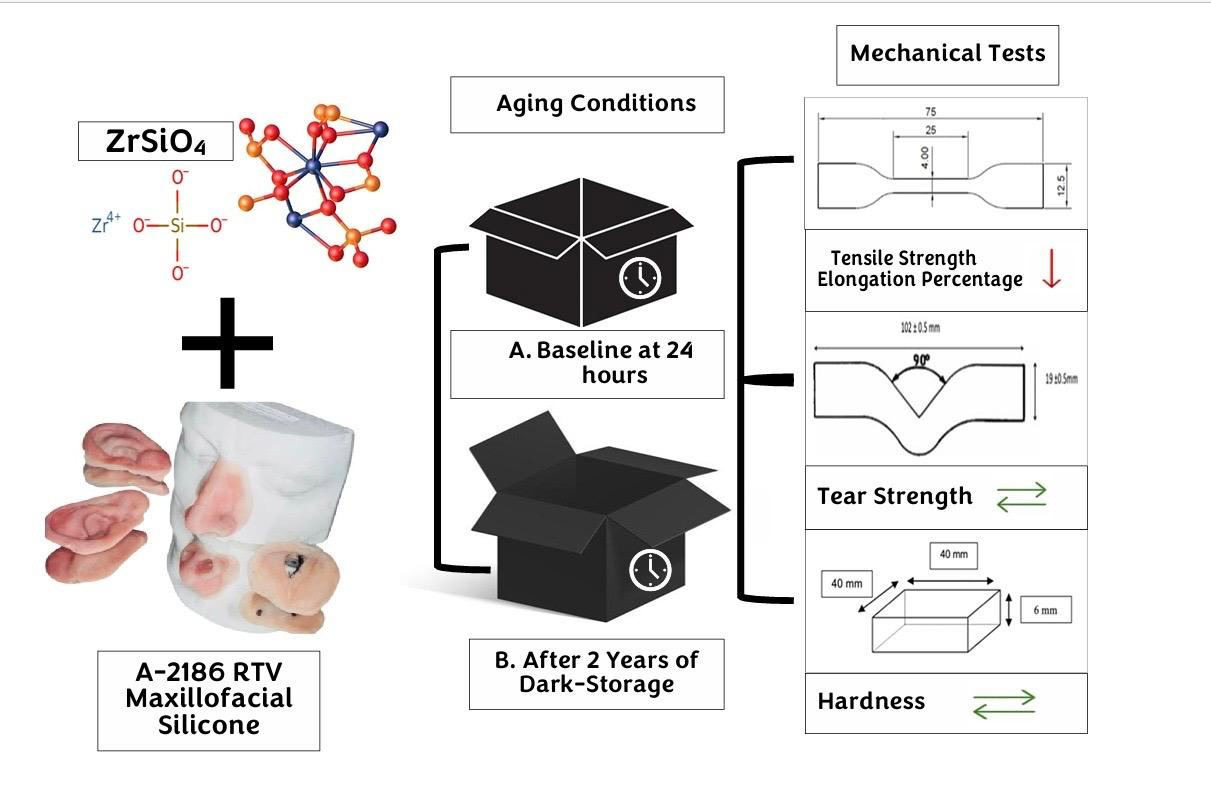 - Although zirconium silicate nanoparticles enhanced the baseline properties of maxillofacial silicone, they did not entirely prevent aging-related deterioration. After two years of dark storage, significant reductions occurred in tensile strength and elongation at break, indicating susceptibility of these properties to long-term degradation.