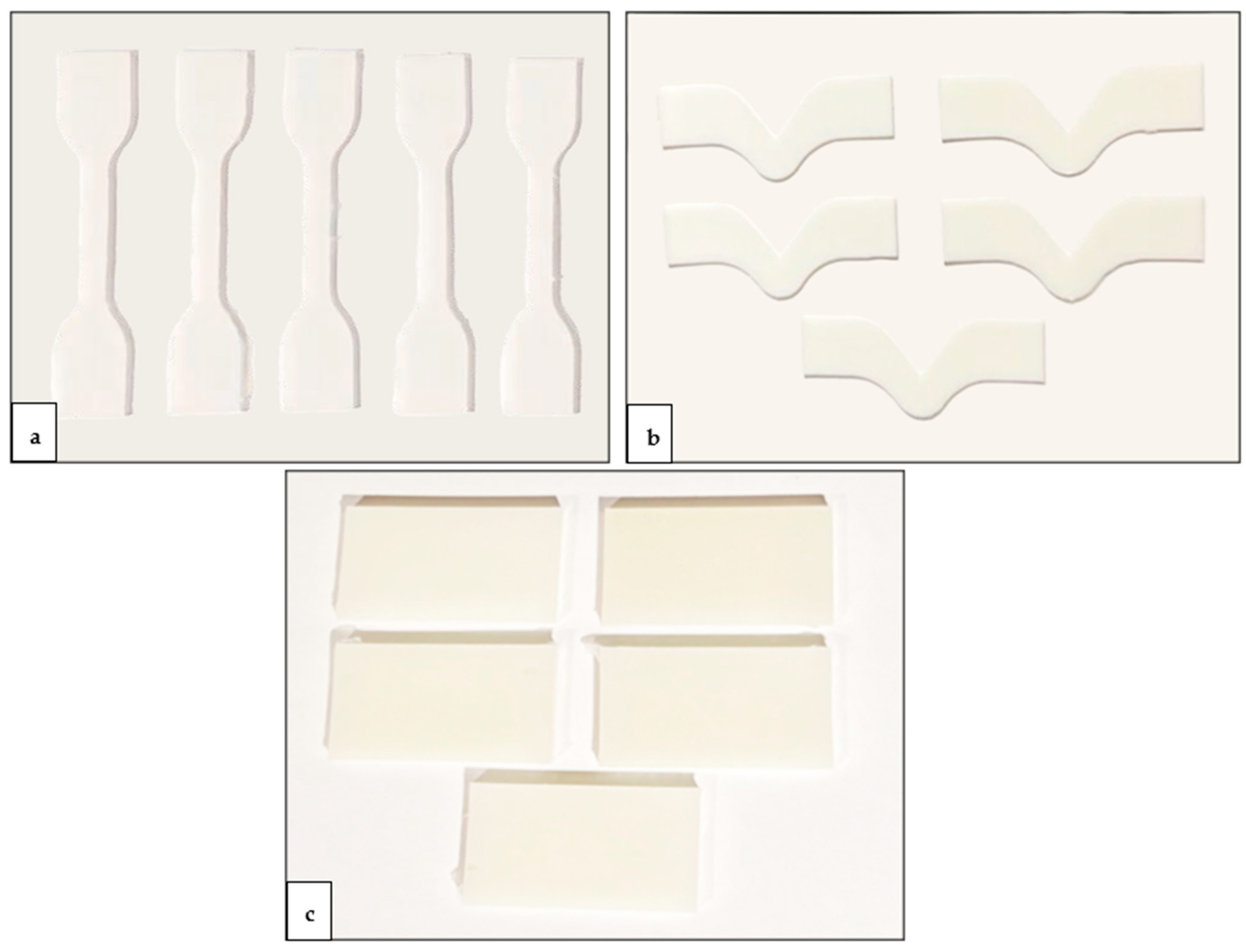 - Baseline group: Specimens were conditioned for a minimum of 16 h after curing and tested after 24 h in accordance with ISO 37:2017 and ISO 20795-1:2013 standards [38,39]. During this period, they were stored in hermetically sealed, light-resistant containers under controlled laboratory conditions (room temperature 23 ± 2 °C, relative humidity 50 ± 5%) [31].