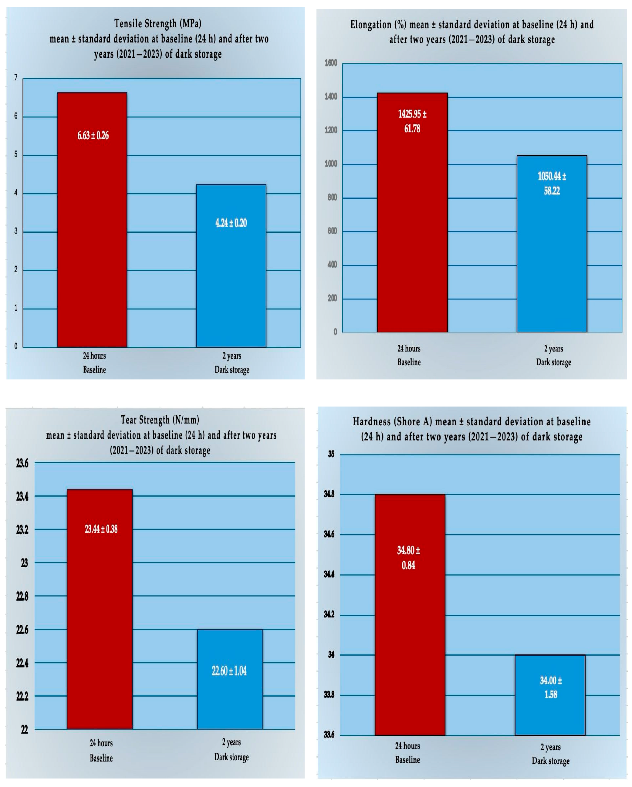 - Tear strength and hardness showed no statistically significant changes after aging, suggesting that these characteristics are less sensitive to dark storage conditions.