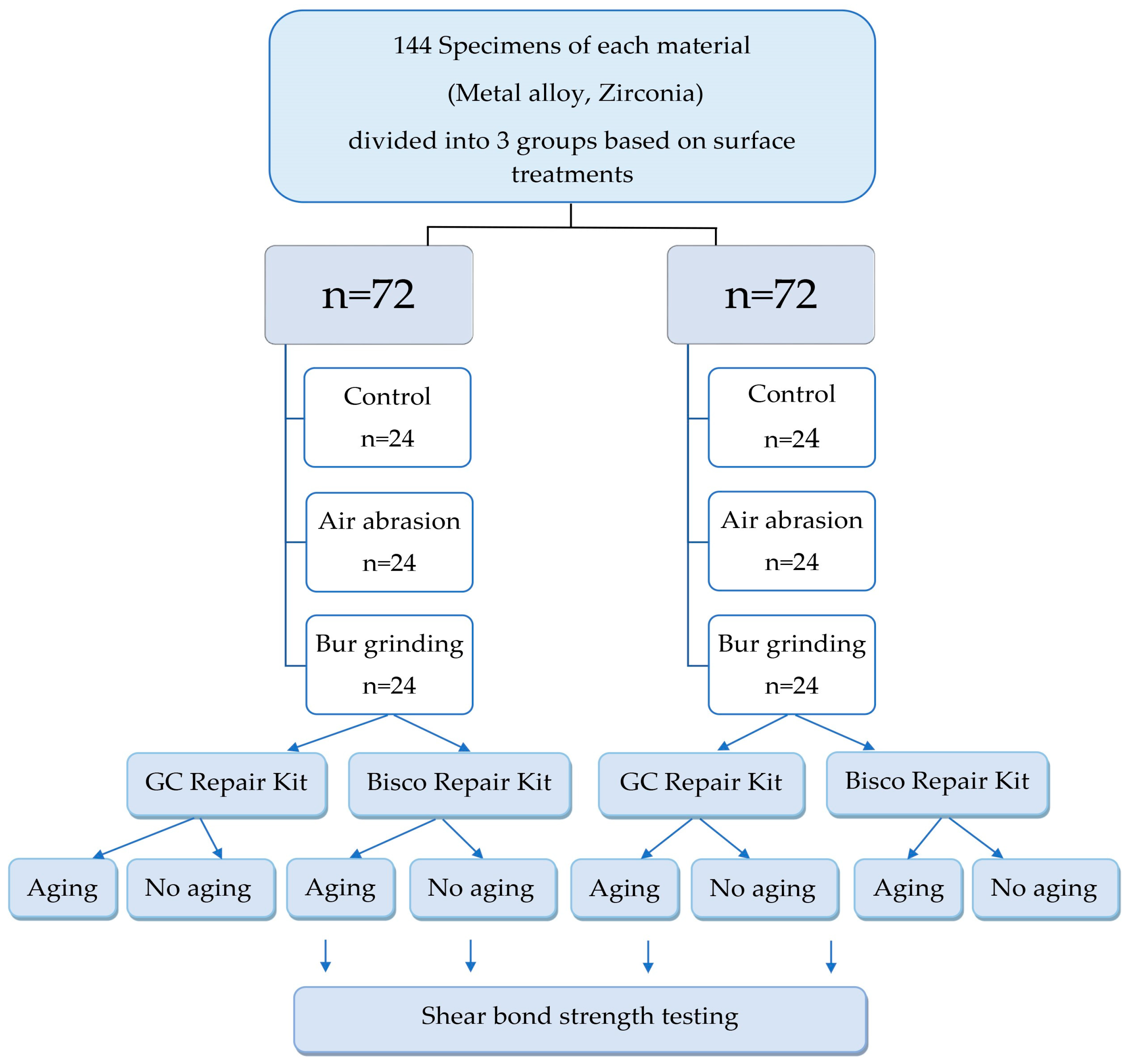This in vitro study aims to assess the effect of mechanical surface treatments, along with two different intra-oral repair kits, on the shear bond strength between composite resin and two types of indirect restorative materials: metal (nickel–chromium alloy) and zirconia. The null hypotheses were as follows: (1) that applying different surface treatment methods to the indirect restorative materials would not result in a statistically significant difference in shear bond strength; (2) that there would be no significant difference in shear bond strength among the different types of restorative materials, regardless of the repair protocol used.