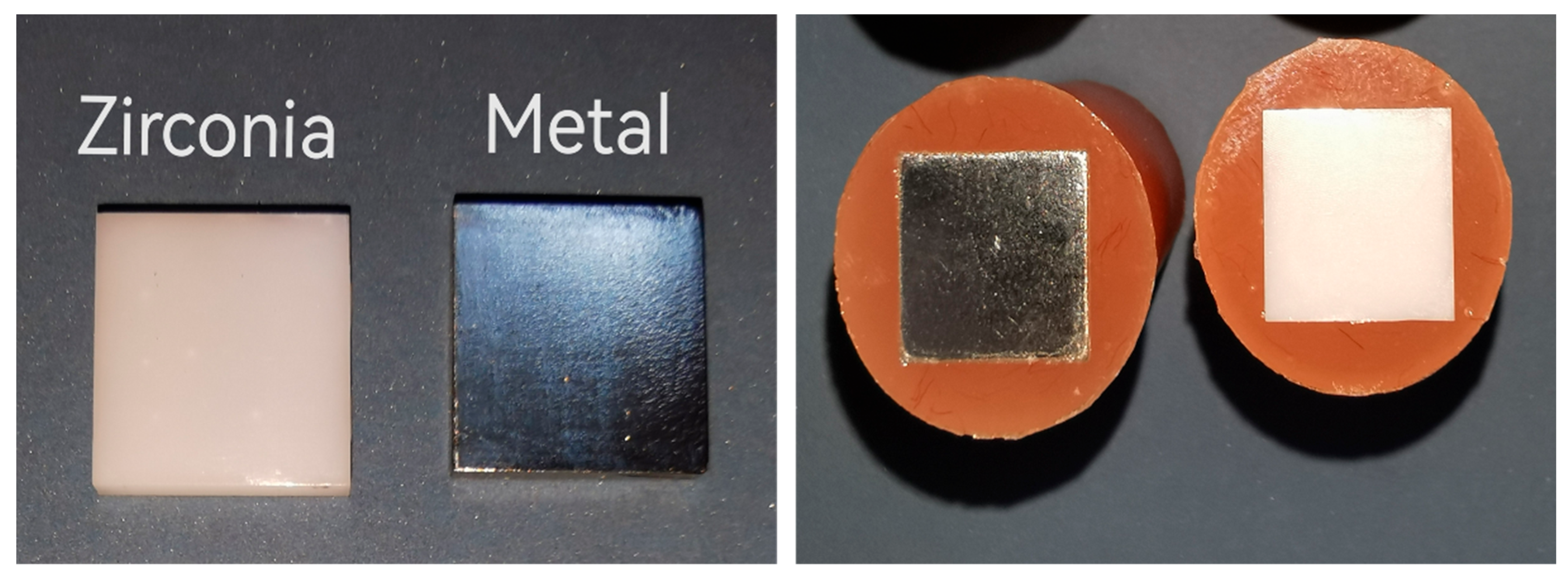All bonding and testing procedures were carried out in a controlled laboratory environment at 23 ± 2 °C and 50 ± 10% relative humidity, consistent with the ISO guideline for dental material testing.