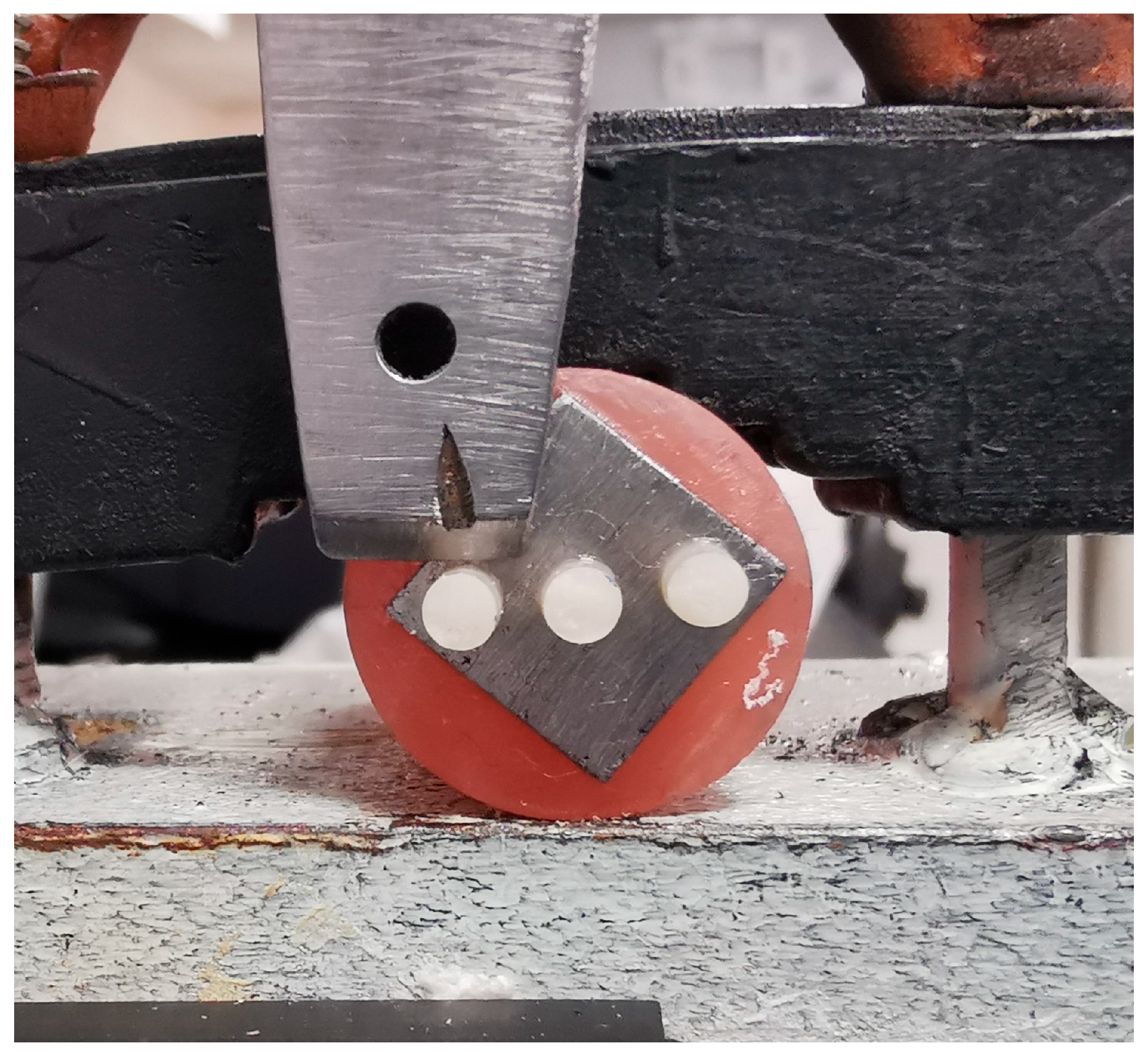 Specimens were mounted in a universal testing machine (MultiTest 1 d, Mecmesin, Slinfold, UK) equipped with an AFG 500 N digital force gauge. The machine was calibrated before testing using a certified reference load cell, following the manufacturer’s standard procedure to ensure measurement accuracy and consistency. A shear force was applied to the bonded composite interface at a crosshead speed of 1.0 mm/min using a knife-edge blade until failure occurred (