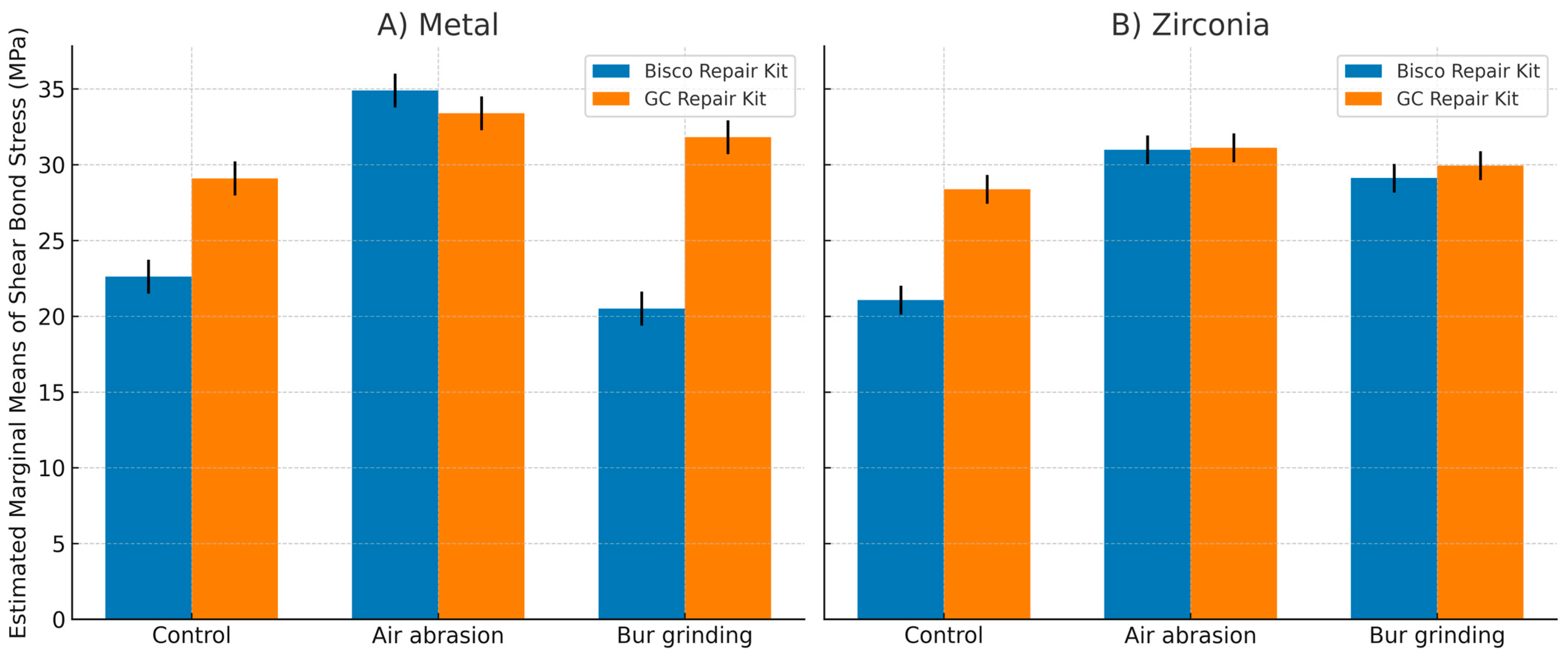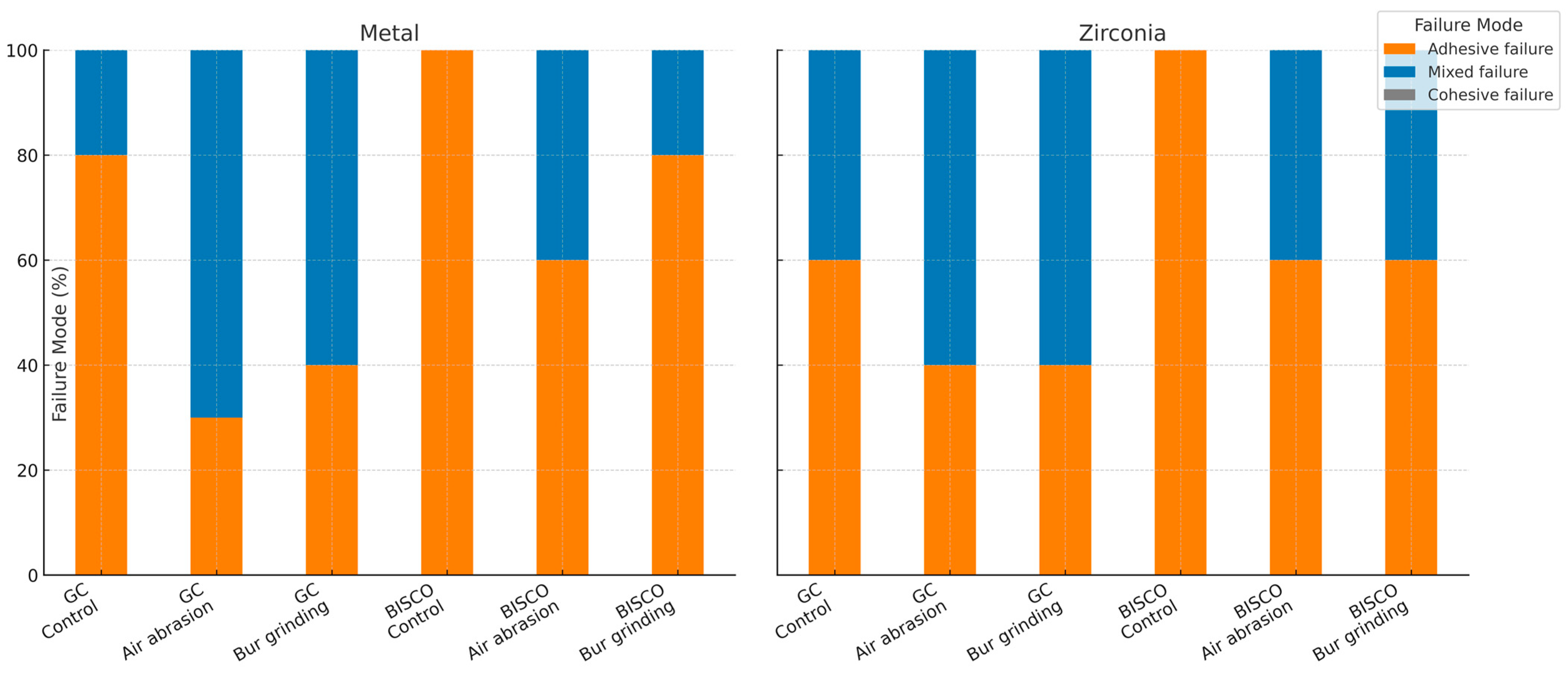 The interaction between the surface treatment and the adhesive system effectiveness highlights that optimal intra-oral repair requires both mechanical and chemical preparation. For metal substrates, GC outperformed Bisco in control and diamond bur groups, but both were similar after air abrasion, indicating that strong mechanical preparation reduces reliance on adhesive type. On zirconia, GC showed higher bond strength in controls, while both adhesives were comparable after mechanical treatment, emphasizing the key role of primer chemistry when roughening is limited.