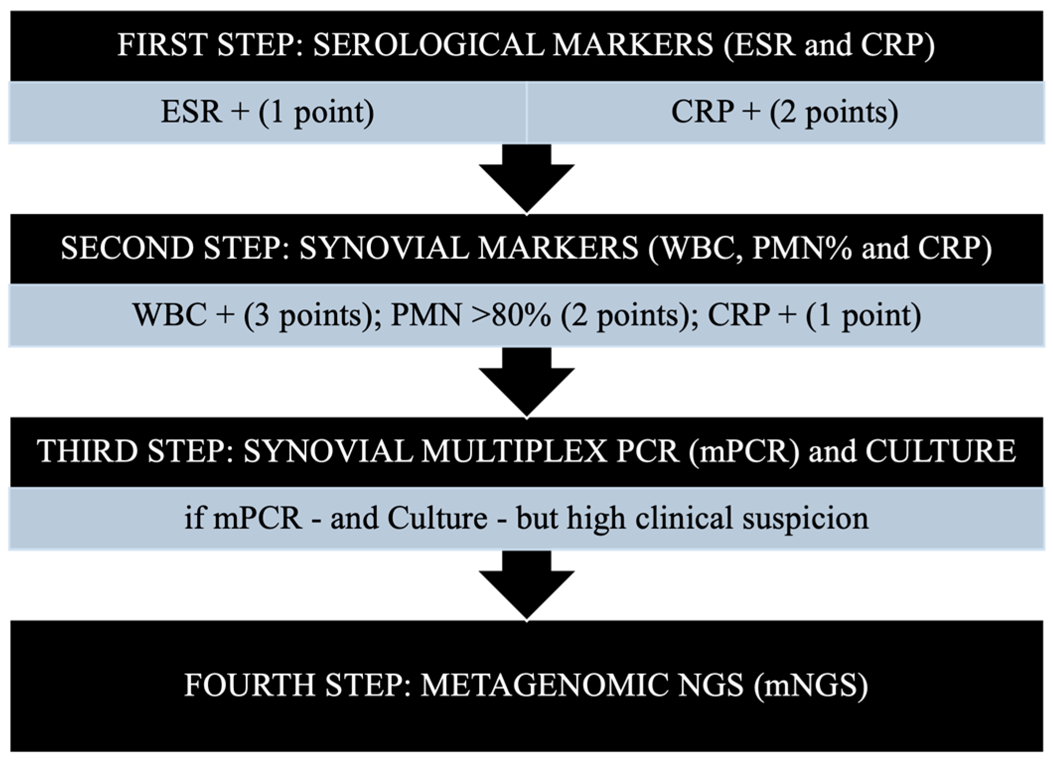 - Indelli, P.F.; Totlis, T.; Lovreković, B.; Engl, M.; Violante, B.; Skowronek, P.; Demey, G.; Ghirardelli, S.; Maci, C.; Castagna, A.; et al. Molecular diagnostics for perioperative microbial identification in periprosthetic joint infection: A scoping review and proposal of a diagnostic flow chart. J. Exp. Orthop. 2025, 12, e70263. [Google Scholar] [CrossRef]