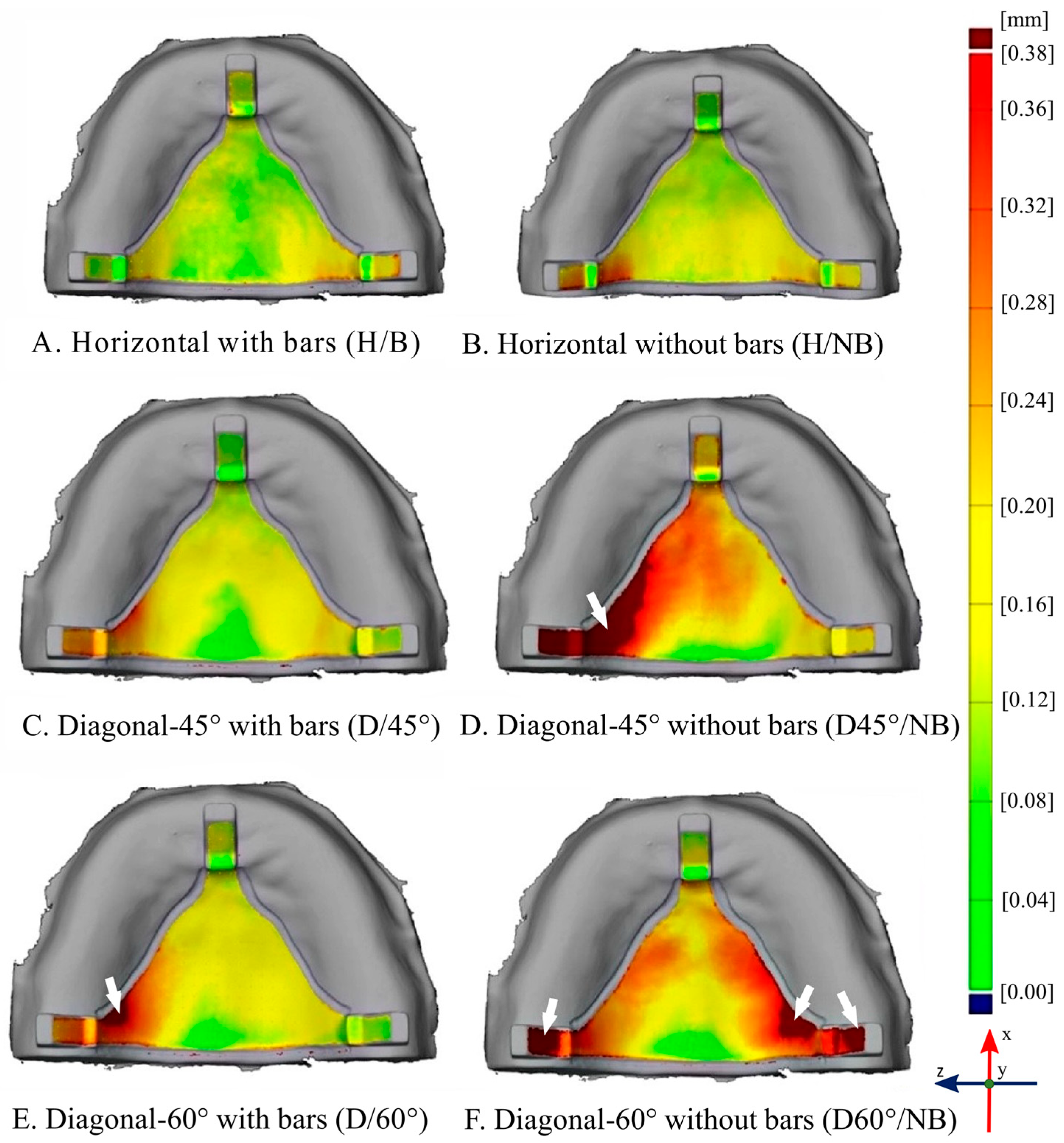 Another interesting finding in the present study, which was provided by the qualitative evaluation, was the observed variation across deformation patterns and their dependency upon FO. Increasing deformation across specimen groups also appears to occur towards a specific direction, i.e., along the axis defined by the sagittal plane (median palatine suture). This increase, however, appears to manifest itself in opposite directions when comparing horizontally (H), to diagonally-45° (D45°) and diagonally-60° (D60°) placed specimens: In the horizontally placed specimen group (H), in the specimens without bars subgroup (H/NB), it seems that the posterior retainers deform by “bending” towards the tissue surface—and thus, the palate does not appear to fit as well as it seems to fit in the specimens with bars (H/B). This can be seen by observing that the retainer areas have more and deeper green appearance than the palate surface in the respective groups (